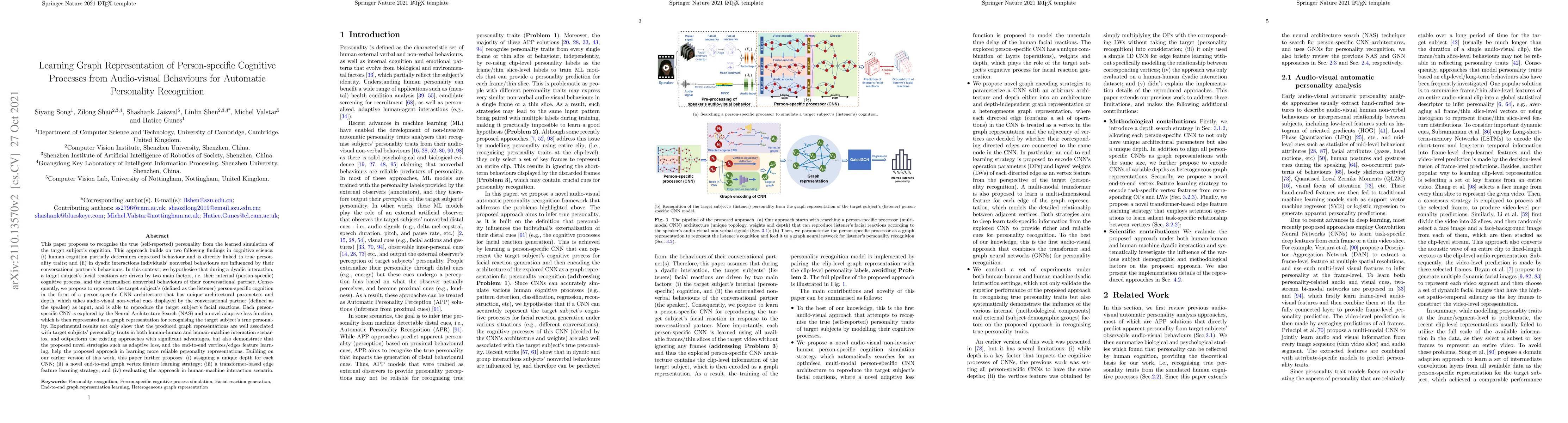 This paper proposes a method to represent person-specific cognitive processes through audio-visual behaviours in dyadic interactions using a person-specific CNN architecture. The approach leverages Neural Architecture Search and an adaptive loss function to create graph representations of individuals' personalities, which outperform existing methods.