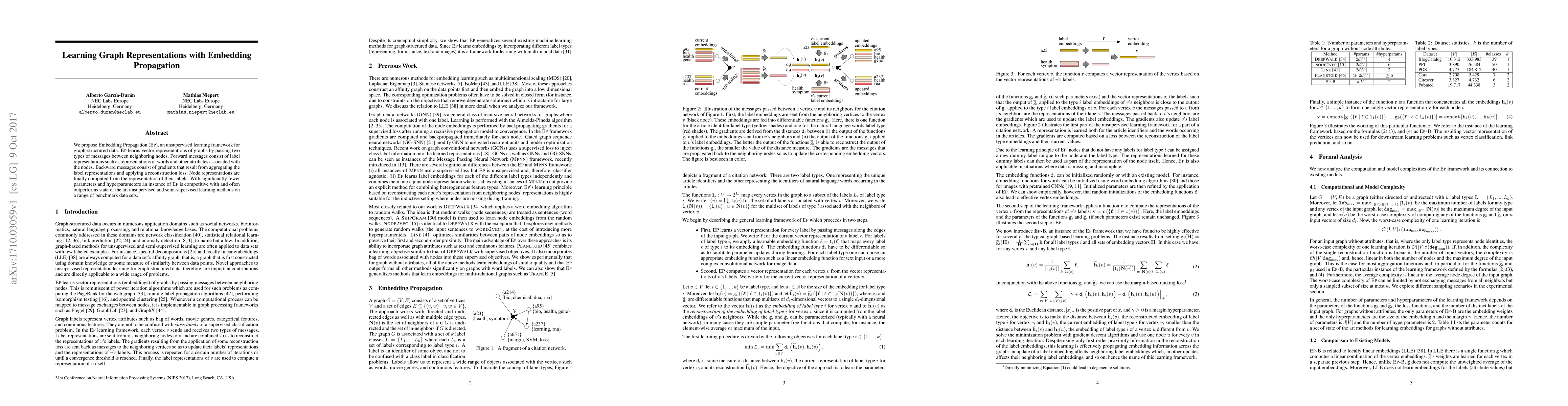 This paper introduces Embedding Propagation (EP), an unsupervised learning method for graph-structured data that uses message passing between nodes to derive node representations. EP outperforms or matches state-of-the-art methods with fewer parameters and hyperparameters.