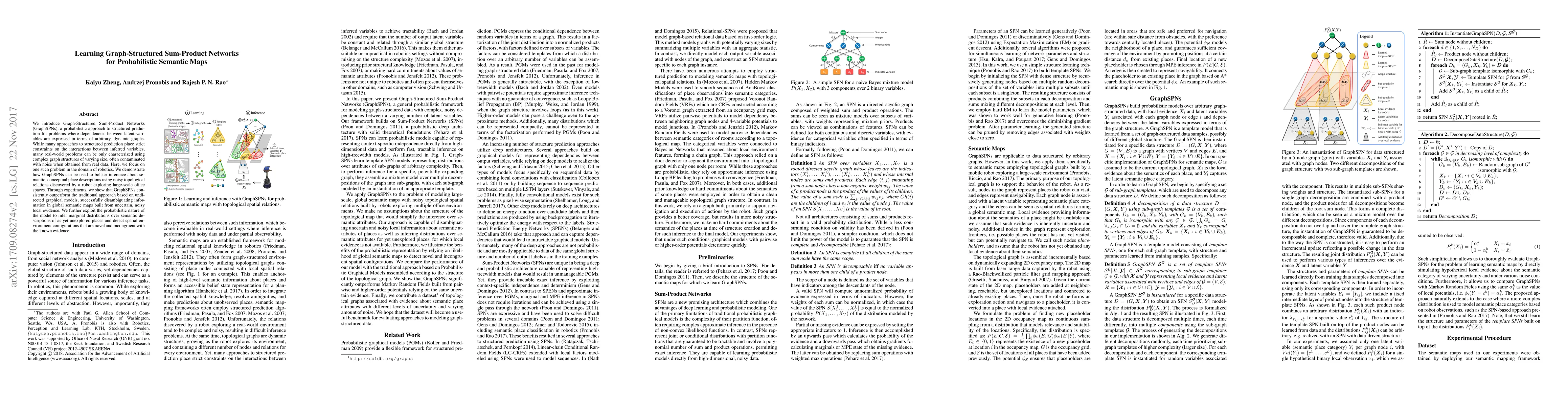 We introduce Graph-Structured Sum-Product Networks (GraphSPNs), a probabilistic approach to structured prediction for problems where dependencies between latent variables are expressed in terms of arbitrary, dynamic graphs. While many approaches to structured prediction place strict constraints on the interactions between inferred variables, many real-world problems can be only characterized using complex graph structures of varying size, often contaminated with noise when obtained from real data. Here, we focus on one such problem in the domain of robotics. We demonstrate how GraphSPNs can be used to bolster inference about semantic, conceptual place descriptions using noisy topological relations discovered by a robot exploring large-scale office spaces. Through experiments, we show that GraphSPNs consistently outperform the traditional approach based on undirected graphical models, successfully disambiguating information in global semantic maps built from uncertain, noisy local evidence. We further exploit the probabilistic nature of the model to infer marginal distributions over semantic descriptions of as yet unexplored places and detect spatial environment configurations that are novel and incongruent with the known evidence.