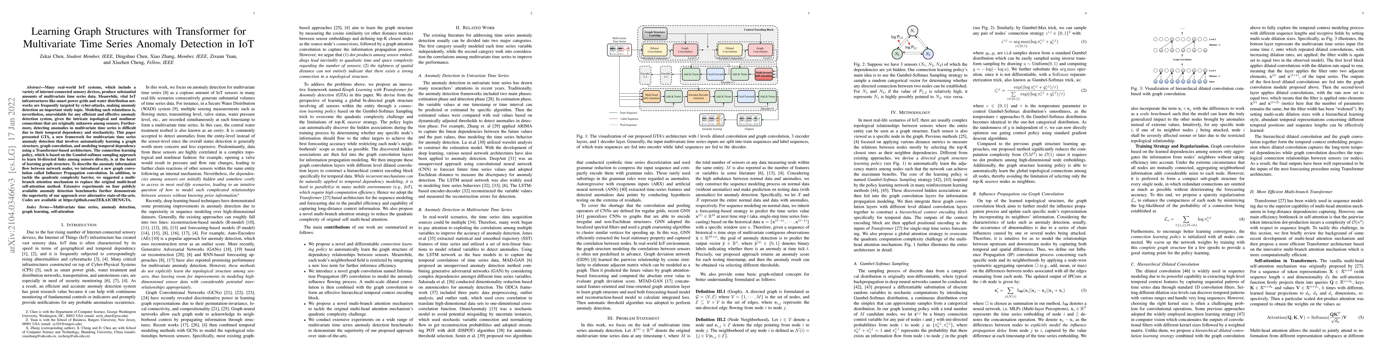 This paper introduces GTA, a framework for detecting anomalies in multivariate IoT time series using a Transformer-based architecture that learns graph structures to model sensor interdependencies. The method includes graph convolution and a multi-branch attention mechanism to efficiently handle complex temporal dependencies.