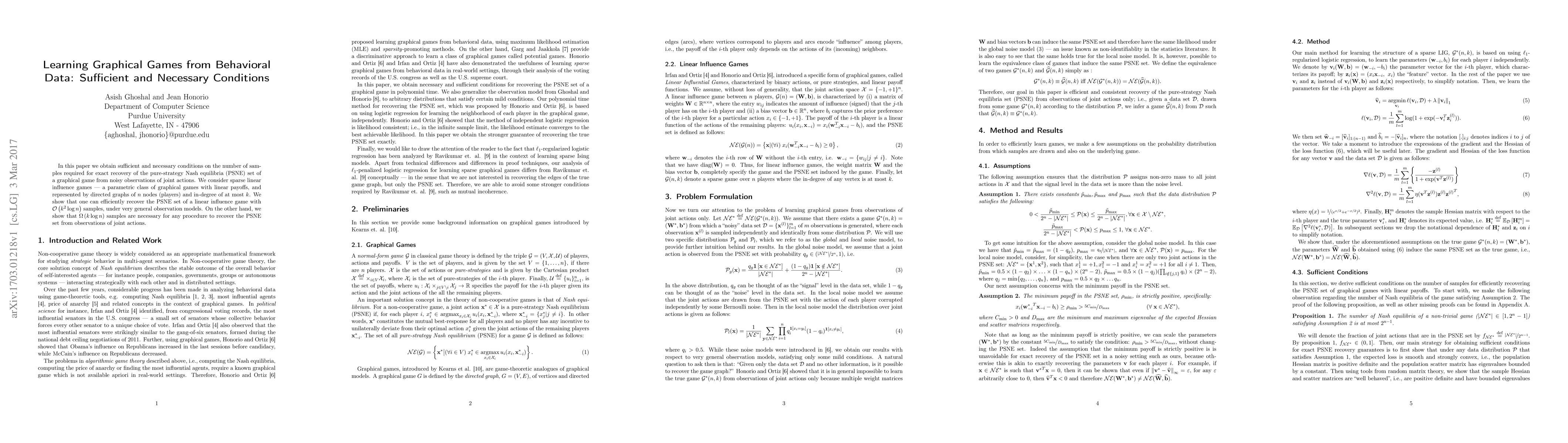 In this paper we obtain sufficient and necessary conditions on the number of samples required for exact recovery of the pure-strategy Nash equilibria (PSNE) set of a graphical game from noisy observations of joint actions. We consider sparse linear influence games --- a parametric class of graphical games with linear payoffs, and represented by directed graphs of n nodes (players) and in-degree of at most k. We show that one can efficiently recover the PSNE set of a linear influence game with $O(k^2 \log n)$ samples, under very general observation models. On the other hand, we show that $\Omega(k \log n)$ samples are necessary for any procedure to recover the PSNE set from observations of joint actions.