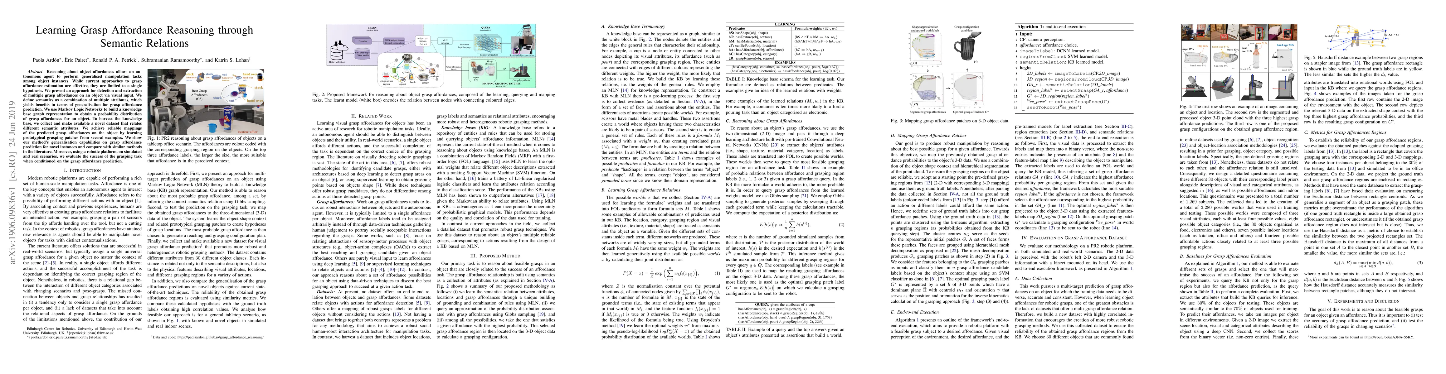 This paper proposes a method for detecting multiple grasp affordances on objects using semantic relations and visual input, employing Markov Logic Networks for a knowledge base graph representation. It introduces a novel dataset to relate semantic attributes and demonstrates generalisation through grasp affordance prediction on new instances, evaluated on both simulated and real robotic platforms.