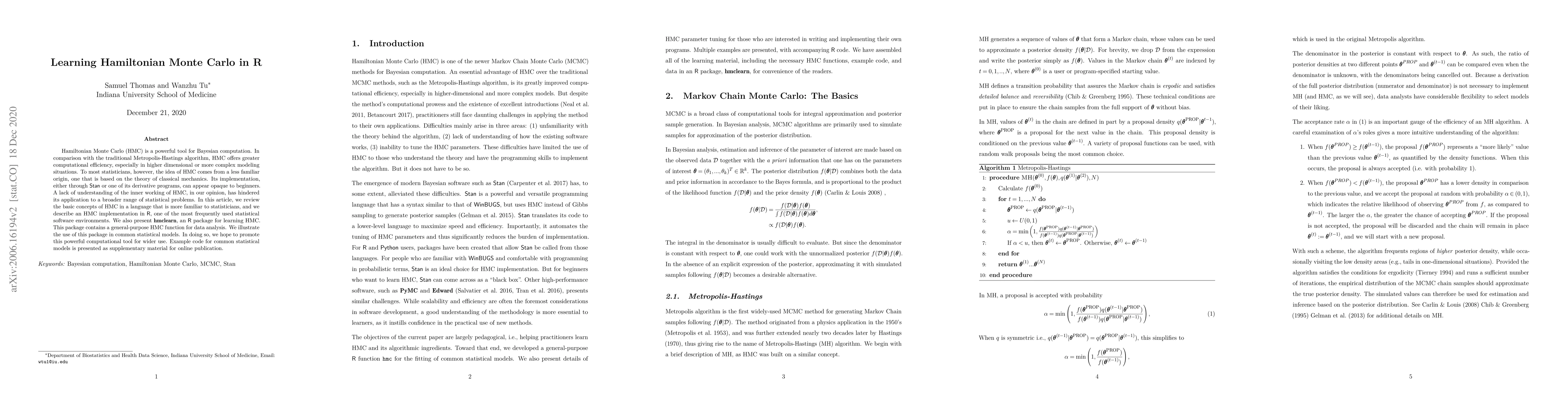 Hamiltonian Monte Carlo (HMC) is a powerful tool for Bayesian computation. In comparison with the traditional Metropolis-Hastings algorithm, HMC offers greater computational efficiency, especially in higher dimensional or more complex modeling situations. To most statisticians, however, the idea of HMC comes from a less familiar origin, one that is based on the theory of classical mechanics. Its implementation, either through Stan or one of its derivative programs, can appear opaque to beginners. A lack of understanding of the inner working of HMC, in our opinion, has hindered its application to a broader range of statistical problems. In this article, we review the basic concepts of HMC in a language that is more familiar to statisticians, and we describe an HMC implementation in R, one of the most frequently used statistical software environments. We also present hmclearn, an R package for learning HMC. This package contains a general-purpose HMC function for data analysis. We illustrate the use of this package in common statistical models. In doing so, we hope to promote this powerful computational tool for wider use. Example code for common statistical models is presented as supplementary material for online publication.