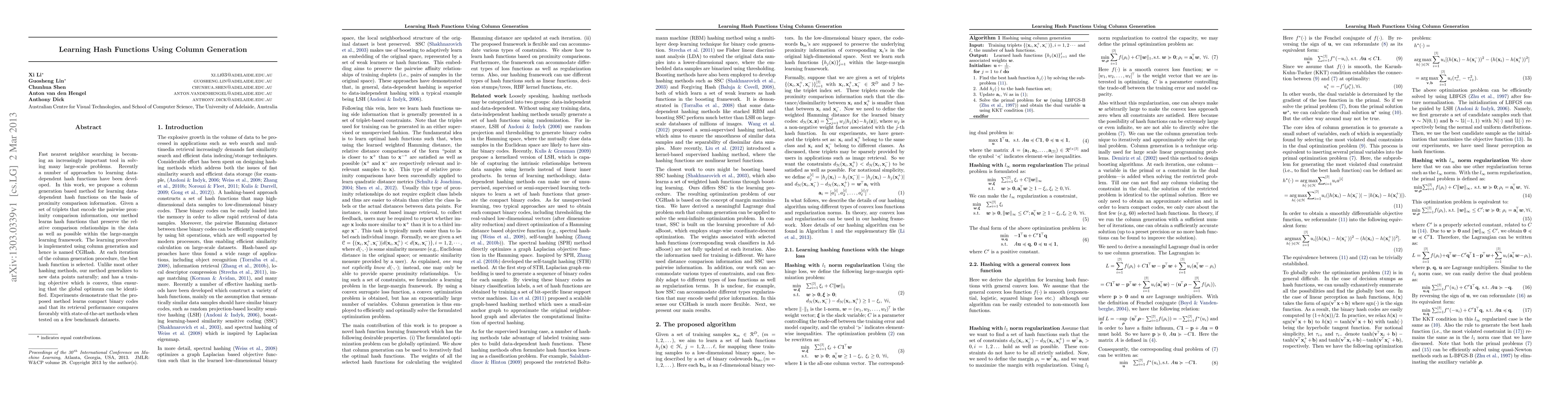 This paper proposes CGHash, a column generation-based method for learning data-dependent hash functions that preserve relative comparison relationships between data points. The method generalizes well and provides a convex training objective, outperforming state-of-the-art methods in nearest neighbor searching tasks.