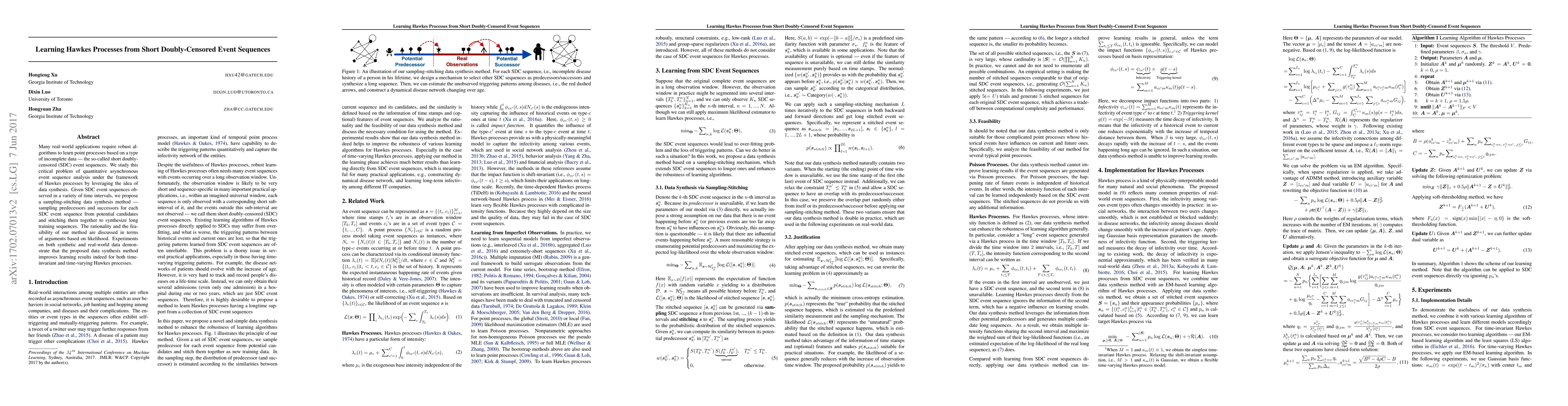 This paper proposes a data synthesis method to learn Hawkes processes from short doubly-censored event sequences by sampling predecessors and successors to create longer training sequences. Experiments show improved learning results for both time-invariant and time-varying Hawkes processes.