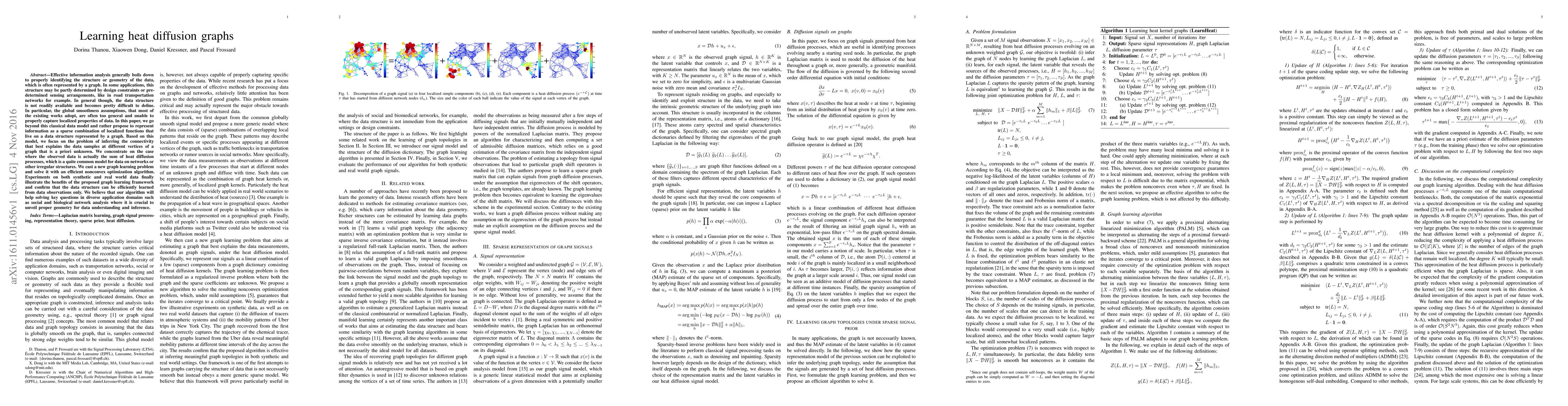 The paper proposes a method for learning graph topologies from signal observations under the assumption that signals are generated from heat diffusion processes starting from a few nodes of the graph. It introduces an algorithm that enforces sparsity of graph signals in a dictionary formed by graph diffusion kernels at different scales.