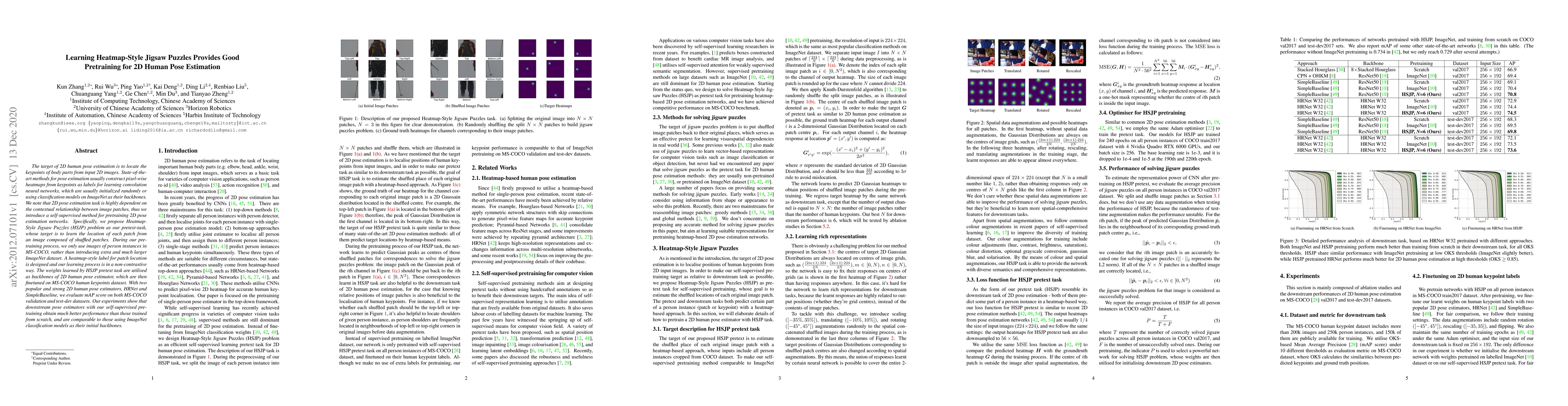 The target of 2D human pose estimation is to locate the keypoints of body parts from input 2D images. State-of-the-art methods for pose estimation usually construct pixel-wise heatmaps from keypoints as labels for learning convolution neural networks, which are usually initialized randomly or using classification models on ImageNet as their backbones. We note that 2D pose estimation task is highly dependent on the contextual relationship between image patches, thus we introduce a self-supervised method for pretraining 2D pose estimation networks. Specifically, we propose Heatmap-Style Jigsaw Puzzles (HSJP) problem as our pretext-task, whose target is to learn the location of each patch from an image composed of shuffled patches. During our pretraining process, we only use images of person instances in MS-COCO, rather than introducing extra and much larger ImageNet dataset. A heatmap-style label for patch location is designed and our learning process is in a non-contrastive way. The weights learned by HSJP pretext task are utilised as backbones of 2D human pose estimator, which are then finetuned on MS-COCO human keypoints dataset. With two popular and strong 2D human pose estimators, HRNet and SimpleBaseline, we evaluate mAP score on both MS-COCO validation and test-dev datasets. Our experiments show that downstream pose estimators with our self-supervised pretraining obtain much better performance than those trained from scratch, and are comparable to those using ImageNet classification models as their initial backbones.