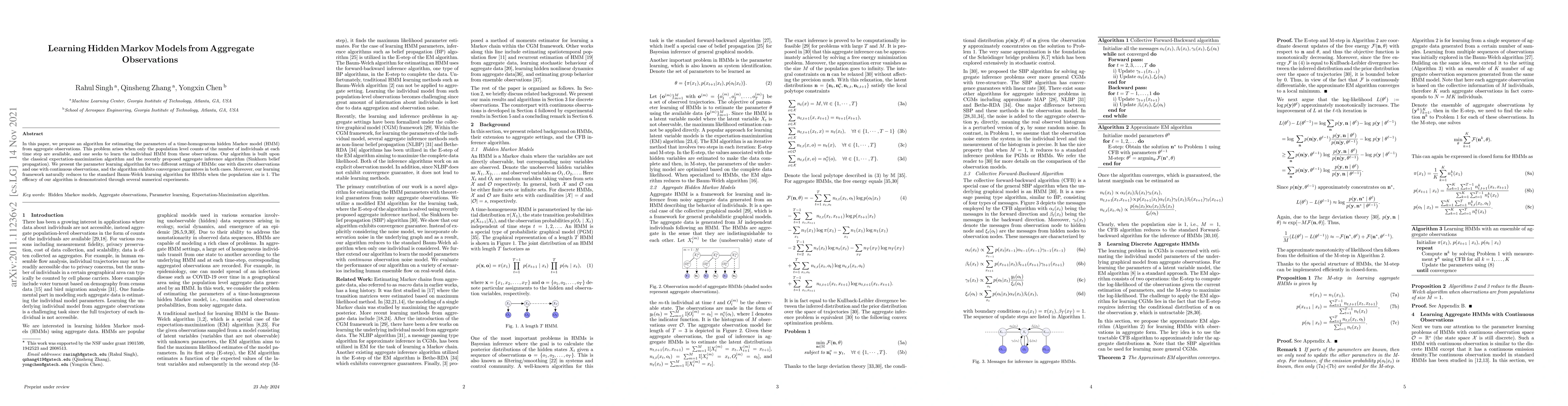 This paper proposes an algorithm for estimating hidden Markov model parameters from aggregate observations using expectation-maximization and Sinkhorn belief propagation. The method offers convergence guarantees and reduces to the Baum-Welch algorithm for individual observations, also extending to continuous observation HMMs.
