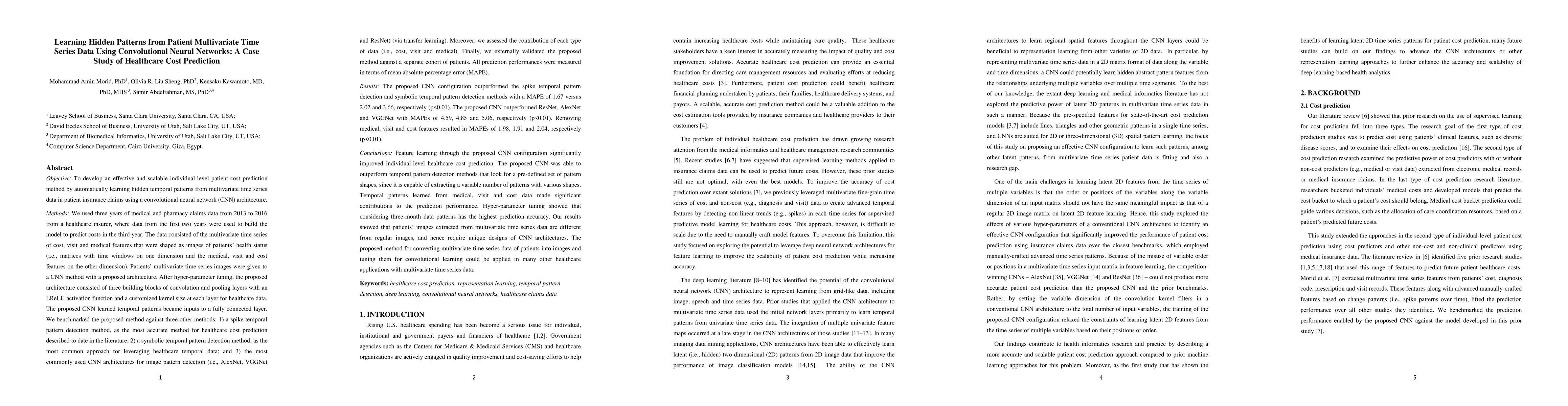 This study developed a convolutional neural network (CNN) to predict individual healthcare costs by learning hidden temporal patterns from patient multivariate time series data. The proposed CNN architecture, optimized through hyper-parameter tuning, significantly outperformed traditional methods, demonstrating the effectiveness of learning variable temporal patterns directly from the data.