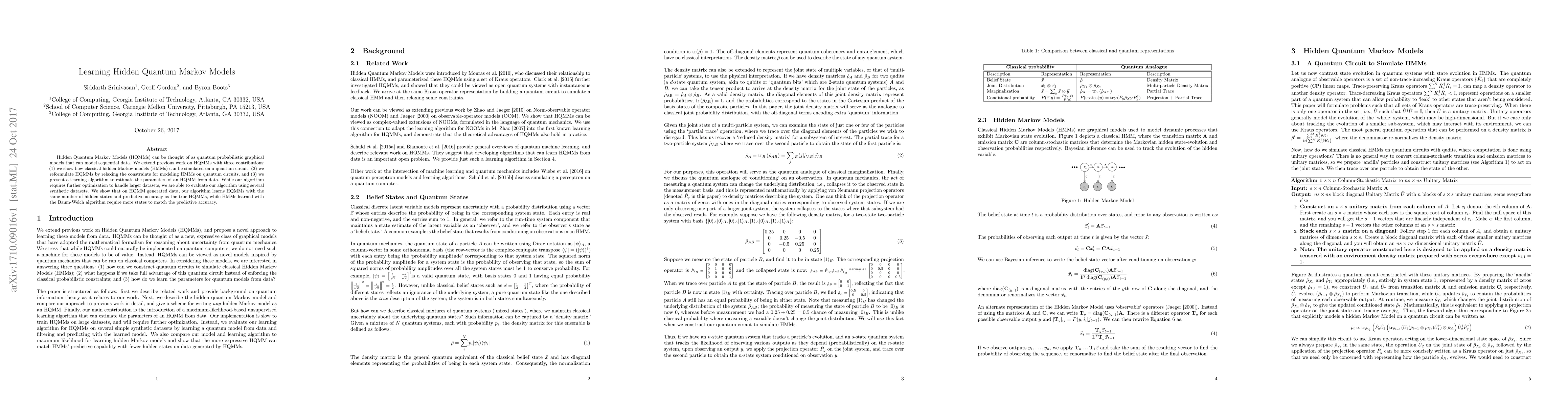 Hidden Quantum Markov Models (HQMMs) can be thought of as quantum probabilistic graphical models that can model sequential data. We extend previous work on HQMMs with three contributions: (1) we show how classical hidden Markov models (HMMs) can be simulated on a quantum circuit, (2) we reformulate HQMMs by relaxing the constraints for modeling HMMs on quantum circuits, and (3) we present a learning algorithm to estimate the parameters of an HQMM from data. While our algorithm requires further optimization to handle larger datasets, we are able to evaluate our algorithm using several synthetic datasets. We show that on HQMM generated data, our algorithm learns HQMMs with the same number of hidden states and predictive accuracy as the true HQMMs, while HMMs learned with the Baum-Welch algorithm require more states to match the predictive accuracy.