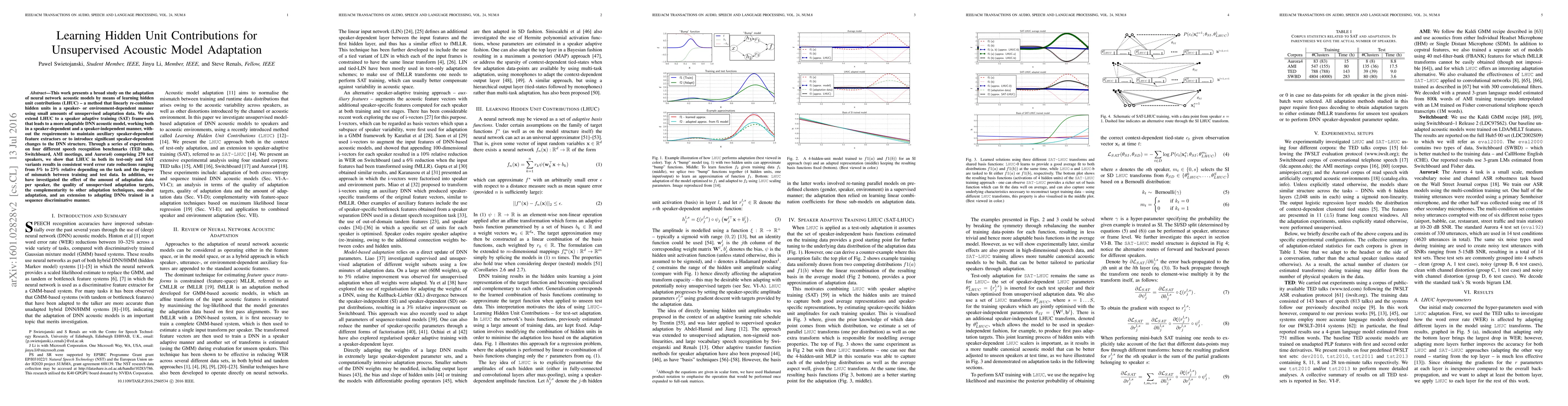 This work presents a broad study on the adaptation of neural network acoustic models by means of learning hidden unit contributions (LHUC) -- a method that linearly re-combines hidden units in a speaker- or environment-dependent manner using small amounts of unsupervised adaptation data. We also extend LHUC to a speaker adaptive training (SAT) framework that leads to a more adaptable DNN acoustic model, working both in a speaker-dependent and a speaker-independent manner, without the requirements to maintain auxiliary speaker-dependent feature extractors or to introduce significant speaker-dependent changes to the DNN structure. Through a series of experiments on four different speech recognition benchmarks (TED talks, Switchboard, AMI meetings, and Aurora4) comprising 270 test speakers, we show that LHUC in both its test-only and SAT variants results in consistent word error rate reductions ranging from 5% to 23% relative depending on the task and the degree of mismatch between training and test data. In addition, we have investigated the effect of the amount of adaptation data per speaker, the quality of unsupervised adaptation targets, the complementarity to other adaptation techniques, one-shot adaptation, and an extension to adapting DNNs trained in a sequence discriminative manner.