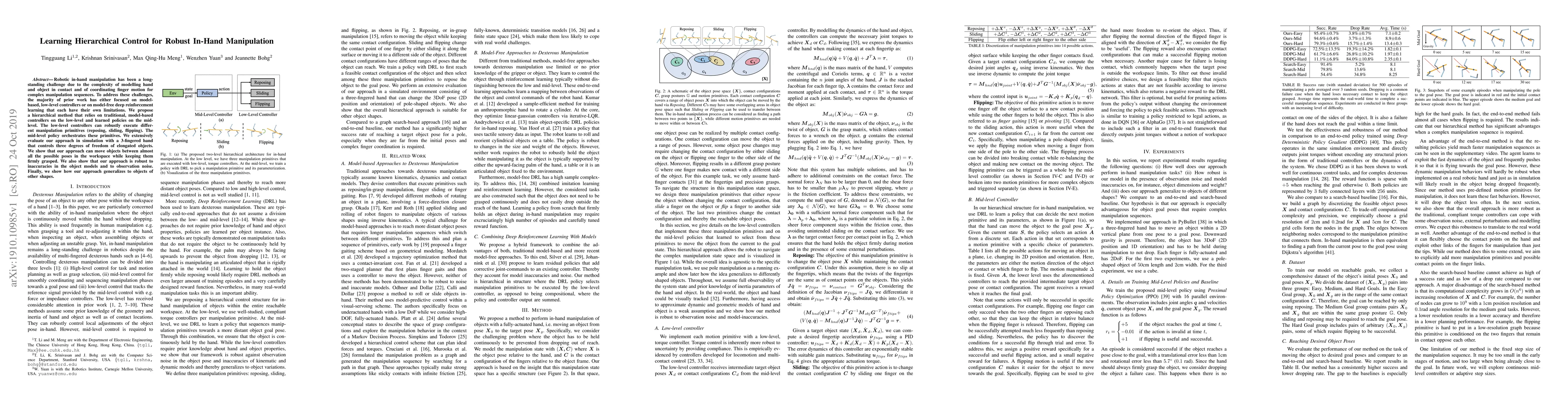 This paper proposes a hierarchical control method for robust in-hand manipulation, combining model-based low-level controllers with learned mid-level policies to coordinate finger motions for complex tasks. The approach demonstrates robustness and generalization to various object shapes and poses in simulation.