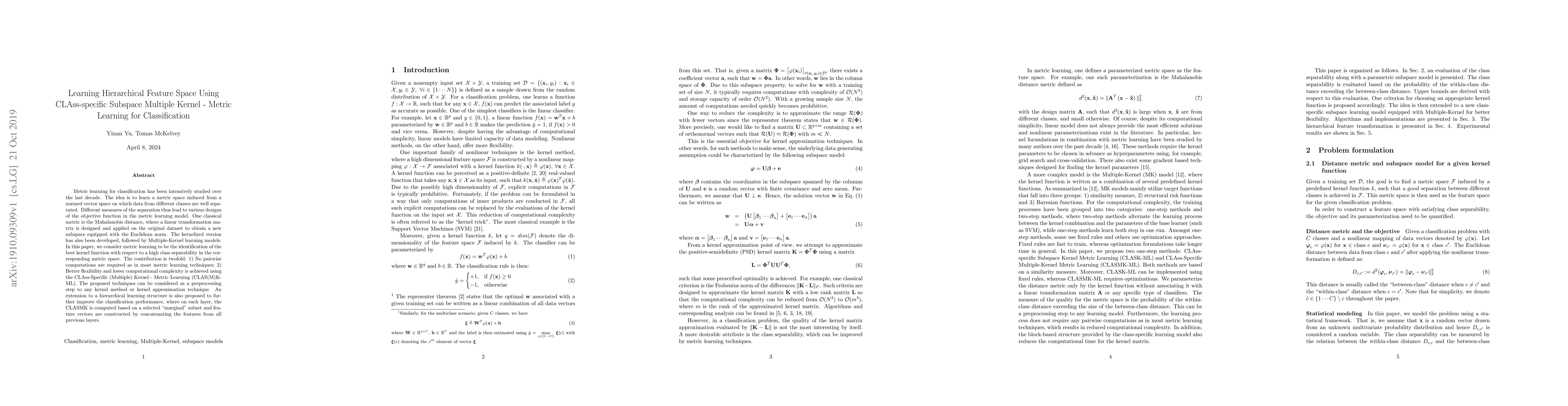This paper proposes a novel metric learning approach called CLAss-Specific Subspace Multiple Kernel -- Metric Learning (CLAS(M)K-ML) that identifies the best kernel function for high class separability without requiring pairwise computations. It also introduces a hierarchical learning structure to enhance classification performance by concatenating features from all previous layers.