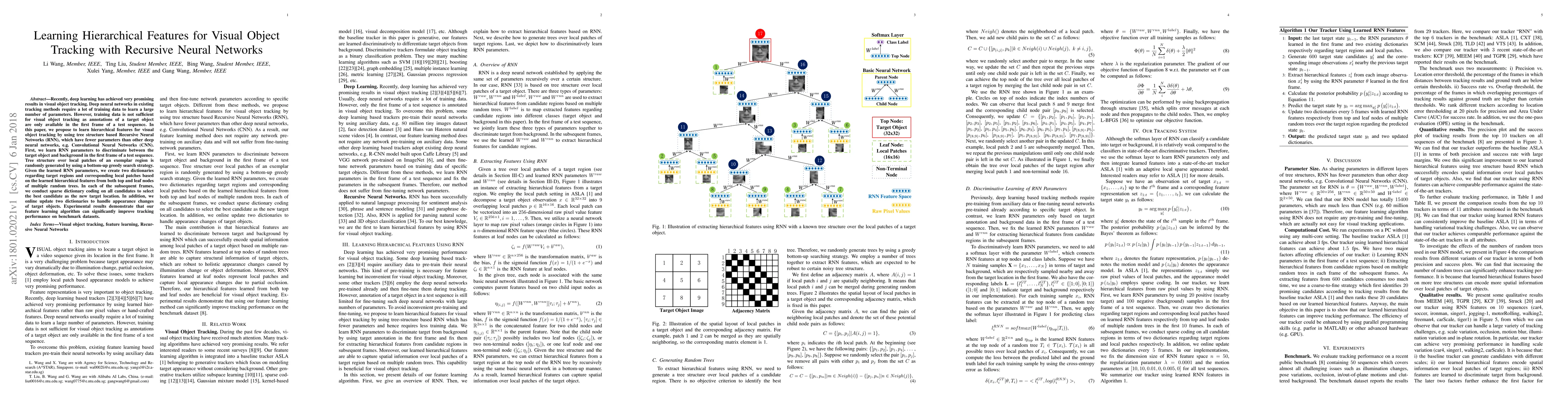 This paper proposes a method for visual object tracking using Recursive Neural Networks (RNN) to learn hierarchical features with fewer parameters than Convolutional Neural Networks (CNN). The RNN-based approach leverages a tree structure to discriminate between target objects and background, updating dictionaries online to handle appearance changes, which results in improved tracking performance.