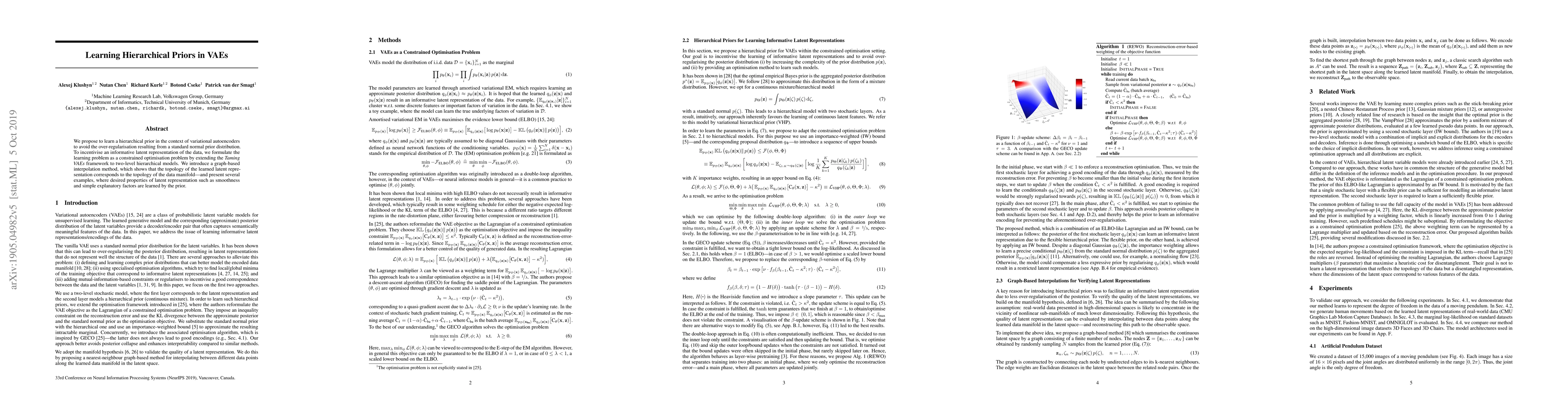 We propose to learn a hierarchical prior in the context of variational autoencoders to avoid the over-regularisation resulting from a standard normal prior distribution. To incentivise an informative latent representation of the data, we formulate the learning problem as a constrained optimisation problem by extending the Taming VAEs framework to two-level hierarchical models. We introduce a graph-based interpolation method, which shows that the topology of the learned latent representation corresponds to the topology of the data manifold---and present several examples, where desired properties of latent representation such as smoothness and simple explanatory factors are learned by the prior.