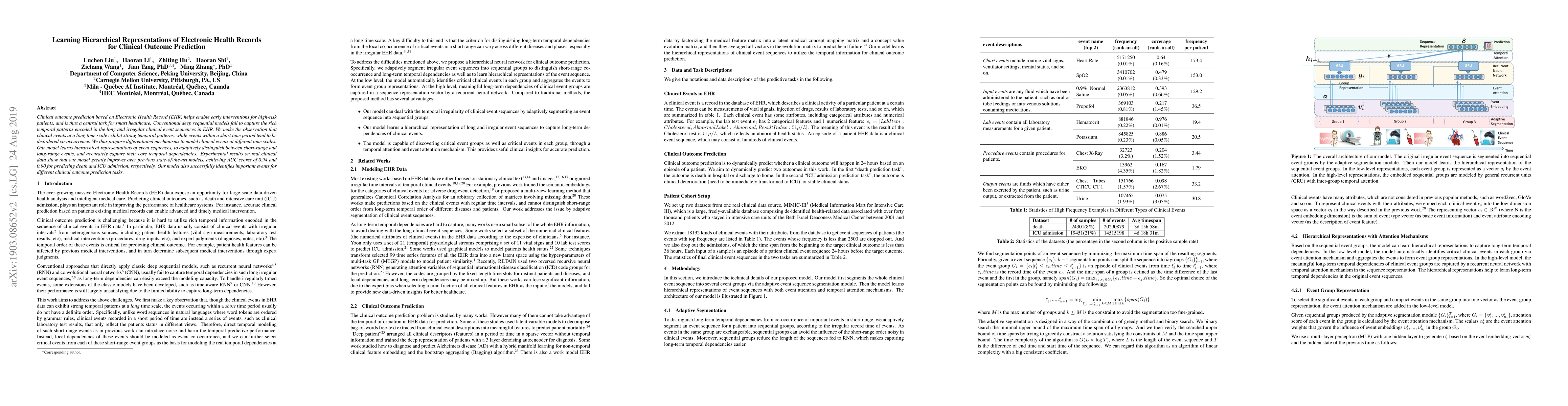 Clinical outcome prediction based on the Electronic Health Record (EHR) plays a crucial role in improving the quality of healthcare. Conventional deep sequential models fail to capture the rich temporal patterns encoded in the longand irregular clinical event sequences. We make the observation that clinical events at a long time scale exhibit strongtemporal patterns, while events within a short time period tend to be disordered co-occurrence. We thus propose differentiated mechanisms to model clinical events at different time scales. Our model learns hierarchical representationsof event sequences, to adaptively distinguish between short-range and long-range events, and accurately capture coretemporal dependencies. Experimental results on real clinical data show that our model greatly improves over previous state-of-the-art models, achieving AUC scores of 0.94 and 0.90 for predicting death and ICU admission respectively, Our model also successfully identifies important events for different clinical outcome prediction tasks