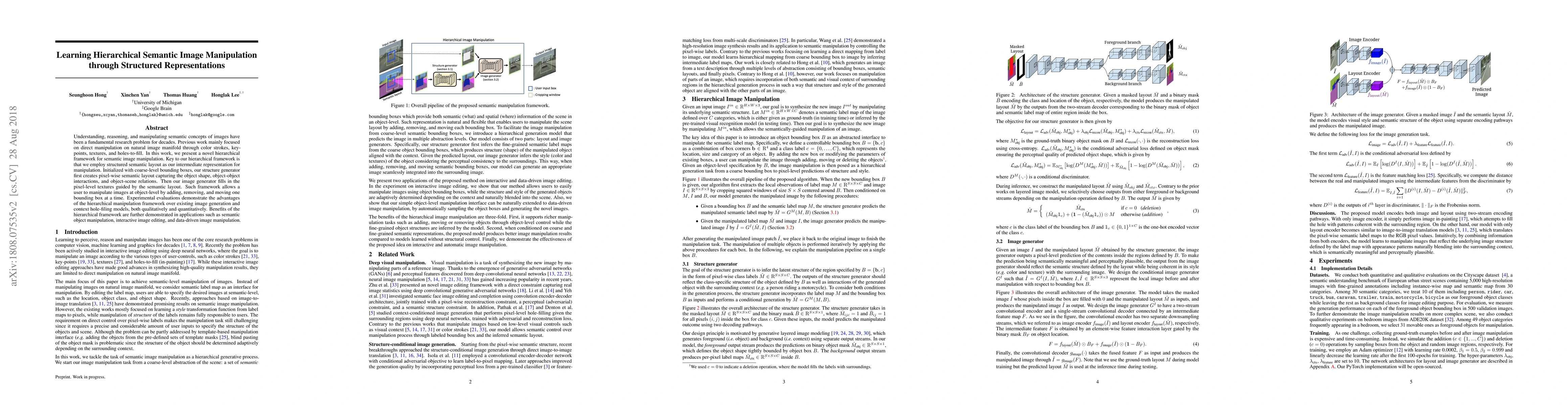 This paper introduces a hierarchical framework for semantic image manipulation using structured representations, enabling users to modify images at the object level by adding, removing, or moving objects through coarse-level bounding boxes. The framework's structured semantic layout and pixel-level texture generation outperform existing methods in both qualitative and quantitative evaluations.