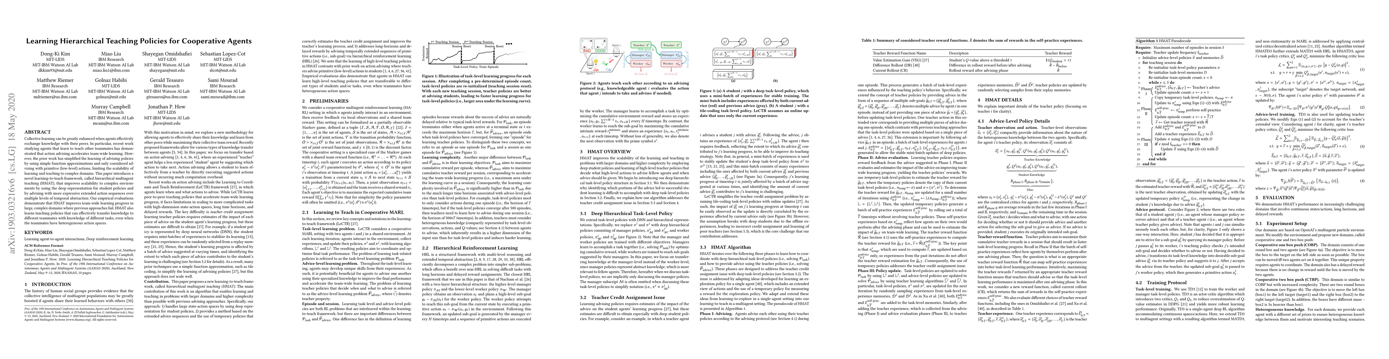 Collective learning can be greatly enhanced when agents effectively exchange knowledge with their peers. In particular, recent work studying agents that learn to teach other teammates has demonstrated that action advising accelerates team-wide learning. However, the prior work has simplified the learning of advising policies by using simple function approximations and only considered advising with primitive (low-level) actions, limiting the scalability of learning and teaching to complex domains. This paper introduces a novel learning-to-teach framework, called hierarchical multiagent teaching (HMAT), that improves scalability to complex environments by using the deep representation for student policies and by advising with more expressive extended action sequences over multiple levels of temporal abstraction. Our empirical evaluations demonstrate that HMAT improves team-wide learning progress in large, complex domains where previous approaches fail. HMAT also learns teaching policies that can effectively transfer knowledge to different teammates with knowledge of different tasks, even when the teammates have heterogeneous action spaces.