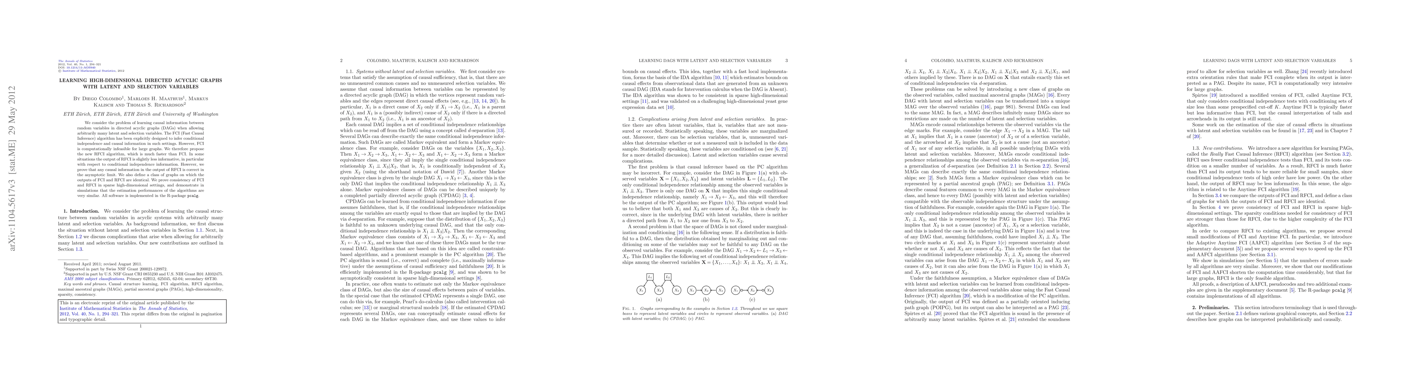 This paper proposes the RFCI algorithm for efficiently learning high-dimensional directed acyclic graphs (DAGs) with latent and selection variables, addressing the computational limitations of the existing FCI algorithm. While RFCI is faster, it maintains correctness of causal information in the asymptotic limit and performs similarly to FCI in sparse settings.