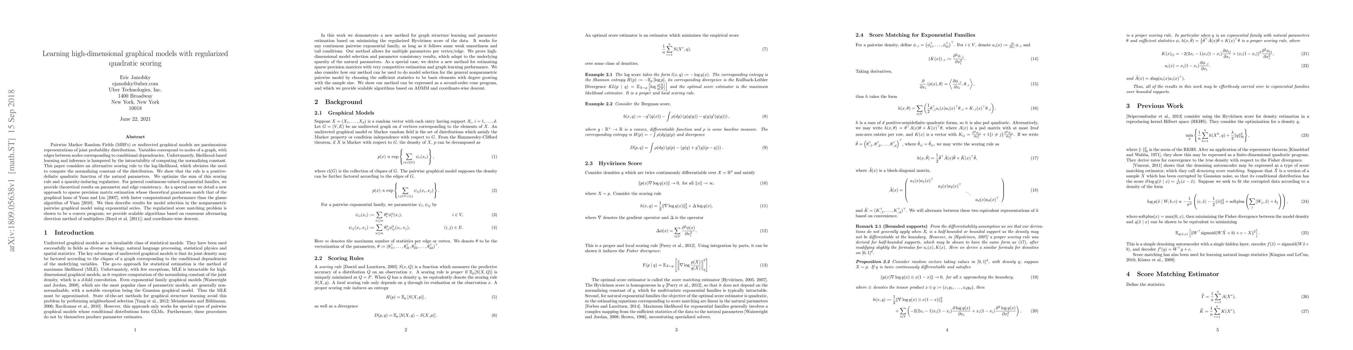 This paper proposes a regularized quadratic scoring approach for learning high-dimensional graphical models without needing to compute the normalizing constant, offering theoretical consistency guarantees and faster computational performance compared to existing methods. Scalable algorithms based on consensus ADMM and coordinate-wise descent are provided for efficient model selection.