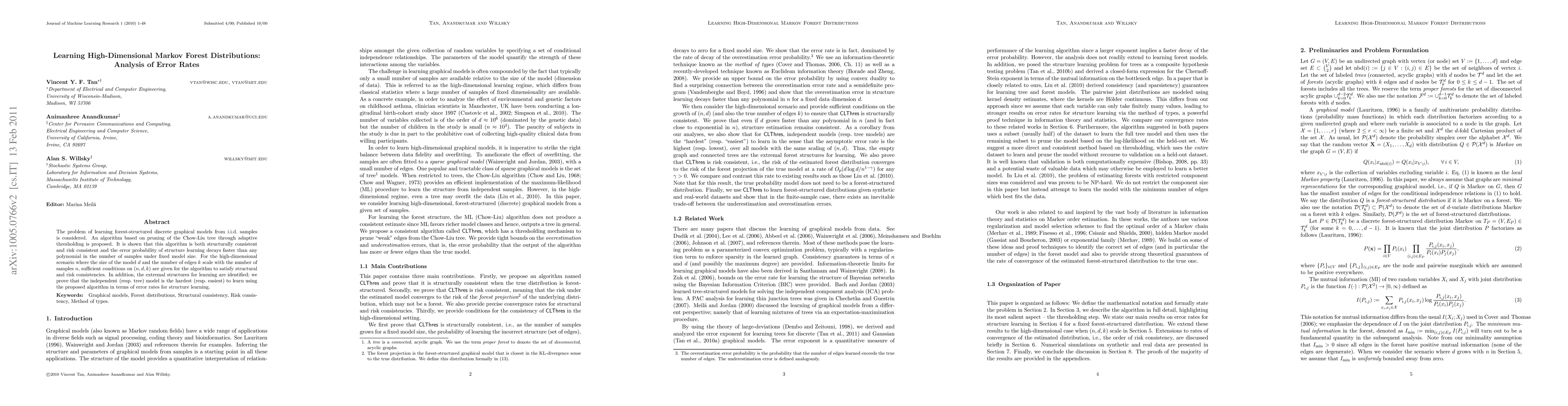 This paper proposes an algorithm for learning high-dimensional Markov forest distributions by pruning the Chow-Liu tree, demonstrating its structural and risk consistency. It identifies extremal learning conditions and shows that the independent model is the hardest to learn while the tree model is the easiest.
