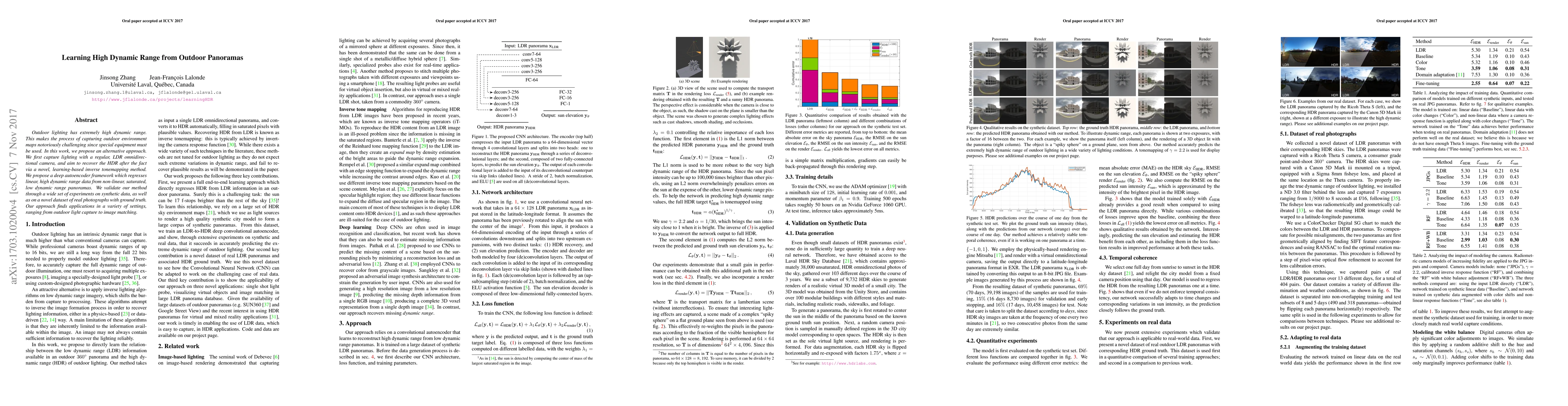 The paper presents a deep autoencoder framework for recovering HDR data from LDR panoramas, utilizing a large dataset of synthetic data composed of a realistic virtual city model lit with real-world HDR sky light probes.