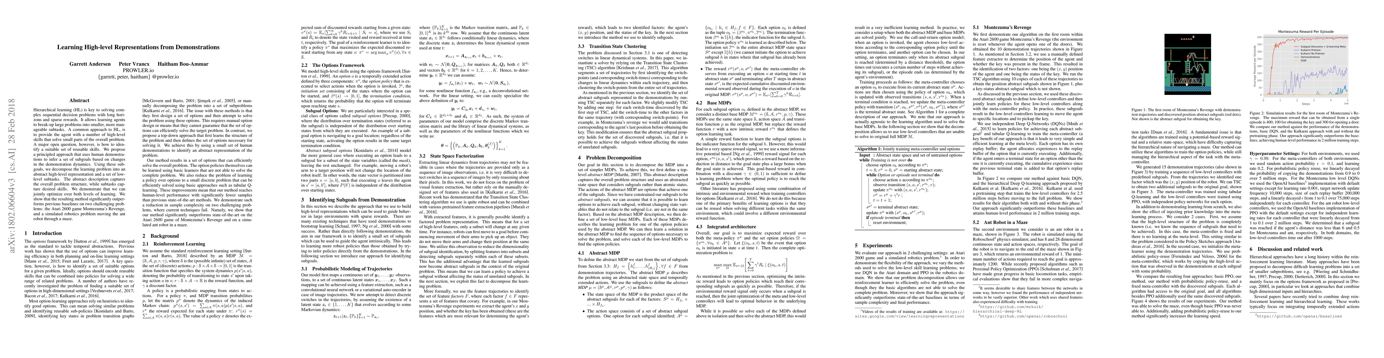 This paper proposes a method for hierarchical learning using human demonstrations to identify reusable high-level skills. It decomposes complex problems into abstract high-level representations and low-level subtasks, showing significant performance improvements over baselines on Atari and robotics tasks.