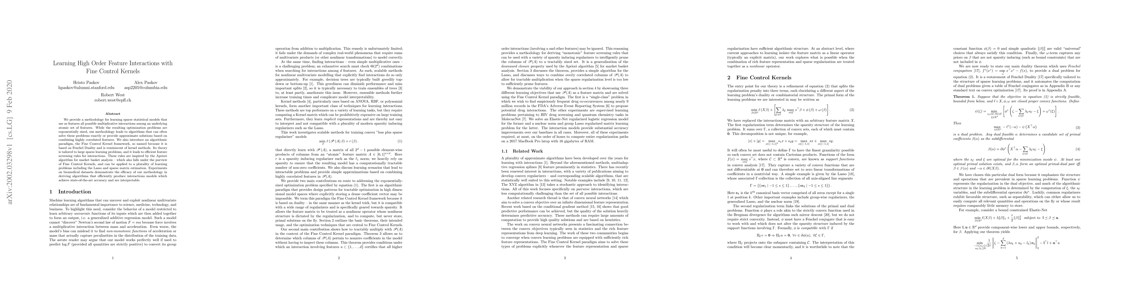 We provide a methodology for learning sparse statistical models that use as features all possible multiplicative interactions among an underlying atomic set of features. While the resulting optimization problems are exponentially sized, our methodology leads to algorithms that can often solve these problems exactly or provide approximate solutions based on combining highly correlated features. We also introduce an algorithmic paradigm, the Fine Control Kernel framework, so named because it is based on Fenchel Duality and is reminiscent of kernel methods. Its theory is tailored to large sparse learning problems, and it leads to efficient feature screening rules for interactions. These rules are inspired by the Apriori algorithm for market basket analysis -- which also falls under the purview of Fine Control Kernels, and can be applied to a plurality of learning problems including the Lasso and sparse matrix estimation. Experiments on biomedical datasets demonstrate the efficacy of our methodology in deriving algorithms that efficiently produce interactions models which achieve state-of-the-art accuracy and are interpretable.