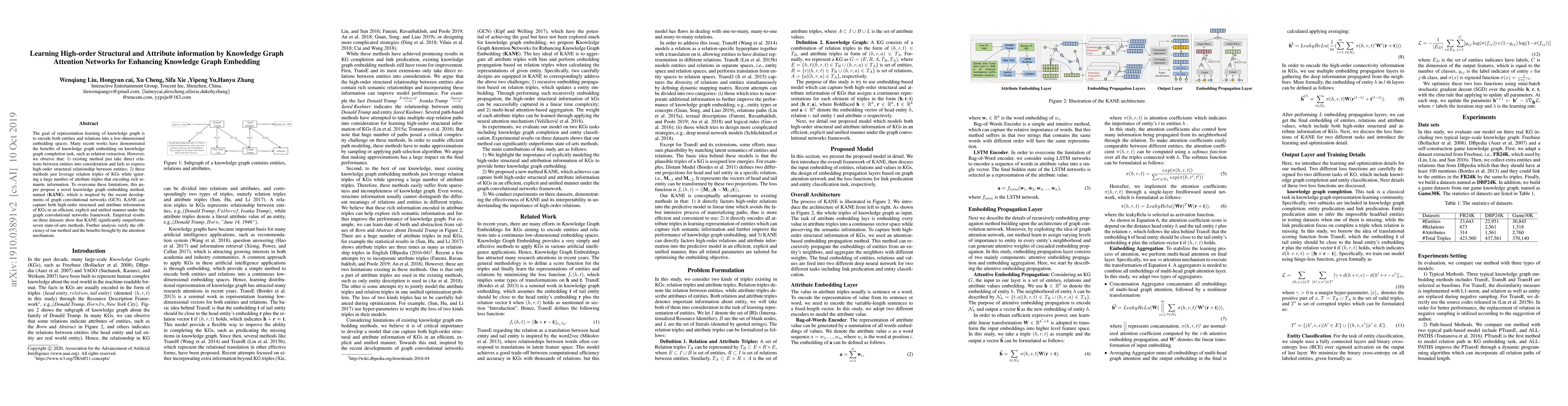 This paper proposes KANE, a novel knowledge graph embedding method that captures high-order structural and attribute information using graph attention networks, outperforming existing methods on knowledge graph completion tasks. KANE integrates both high-order relationships and attribute triples, demonstrating significant improvements in efficiency and performance.