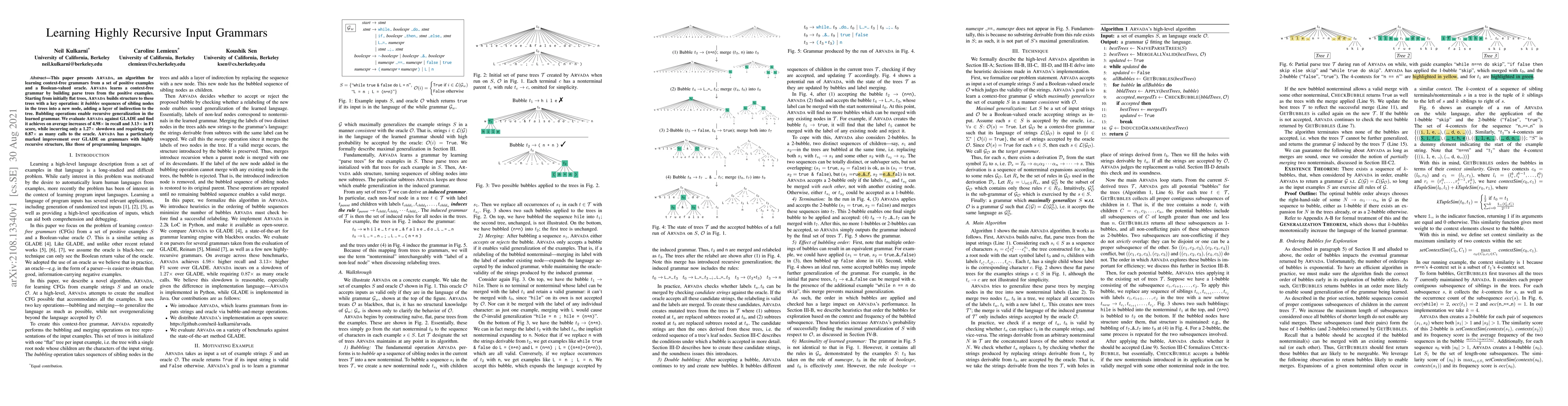 Arvada is an algorithm for learning context-free grammars from positive examples and a Boolean oracle, achieving significant improvements in recall and F1 score over GLADE, especially for highly recursive grammars. It uses bubbling operations to build recursive structures in parse trees.