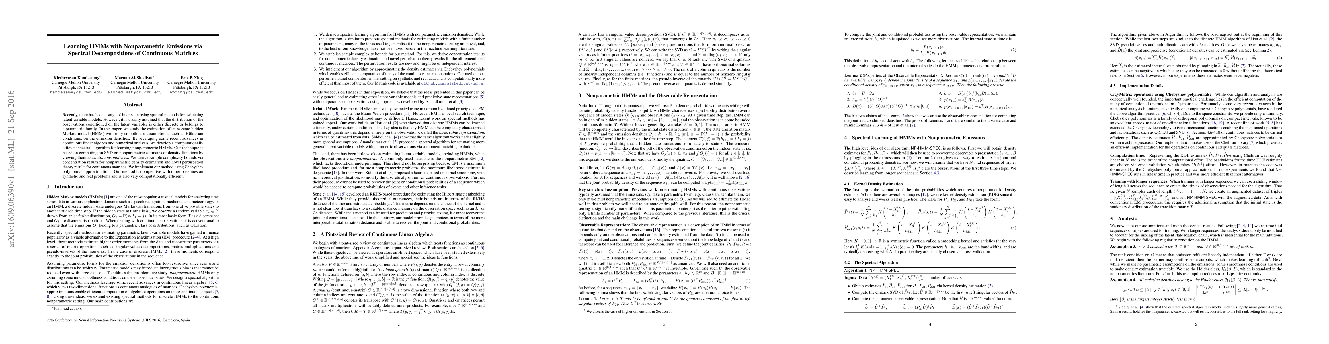 This paper proposes a spectral algorithm for estimating nonparametric hidden Markov models (HMMs) by leveraging continuous matrix decompositions and Chebyshev polynomial approximations. The method is computationally efficient and competitive with other baselines, achieving good performance on both synthetic and real datasets.