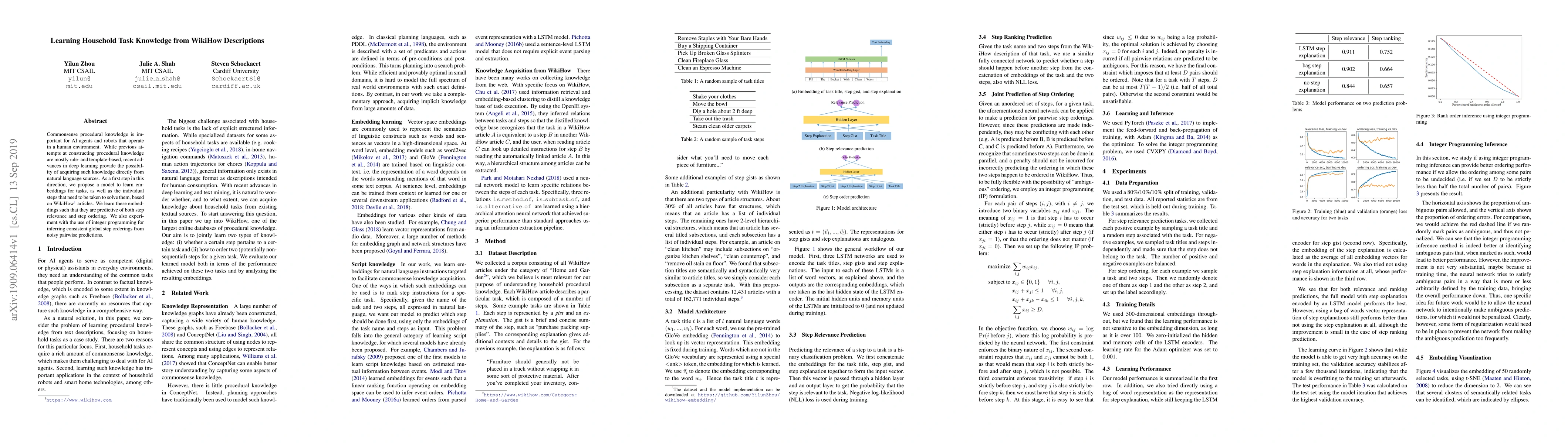 Commonsense procedural knowledge is important for AI agents and robots that operate in a human environment. While previous attempts at constructing procedural knowledge are mostly rule- and template-based, recent advances in deep learning provide the possibility of acquiring such knowledge directly from natural language sources. As a first step in this direction, we propose a model to learn embeddings for tasks, as well as the individual steps that need to be taken to solve them, based on WikiHow articles. We learn these embeddings such that they are predictive of both step relevance and step ordering. We also experiment with the use of integer programming for inferring consistent global step orderings from noisy pairwise predictions.