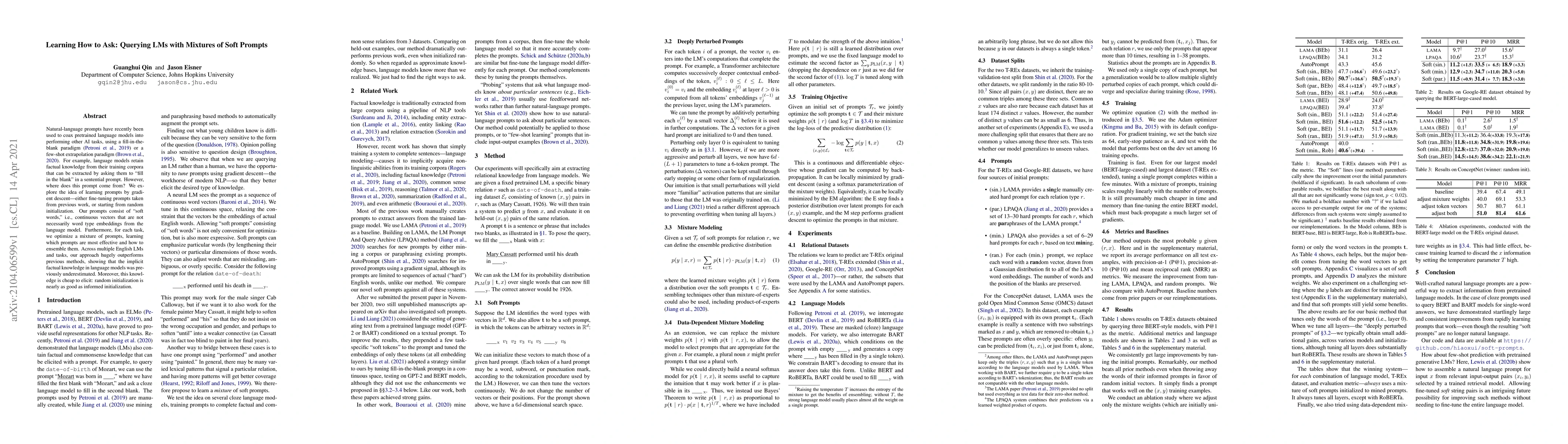 This paper investigates learning prompts through gradient descent to optimize mixtures of "soft words" for querying pretrained language models, achieving significant improvements over previous methods. The study demonstrates that even random initialization can be nearly as effective, suggesting that language models contain more implicit factual knowledge than previously recognized.