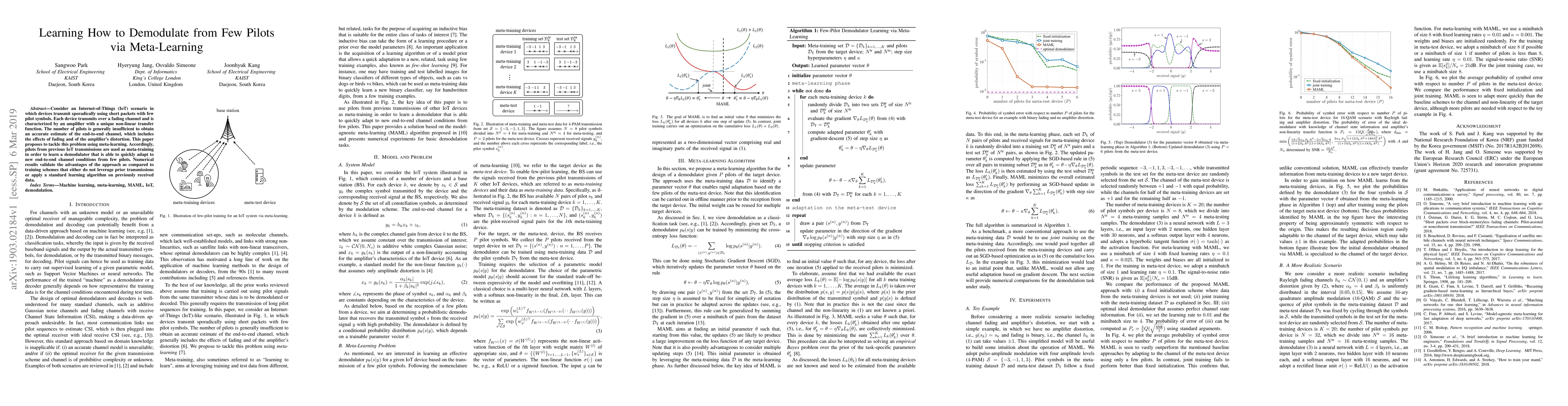 The paper proposes a meta-learning approach for demodulation in IoT scenarios with few pilots, using previous transmissions as meta-training data to adapt quickly to new channel conditions via the MAML algorithm.