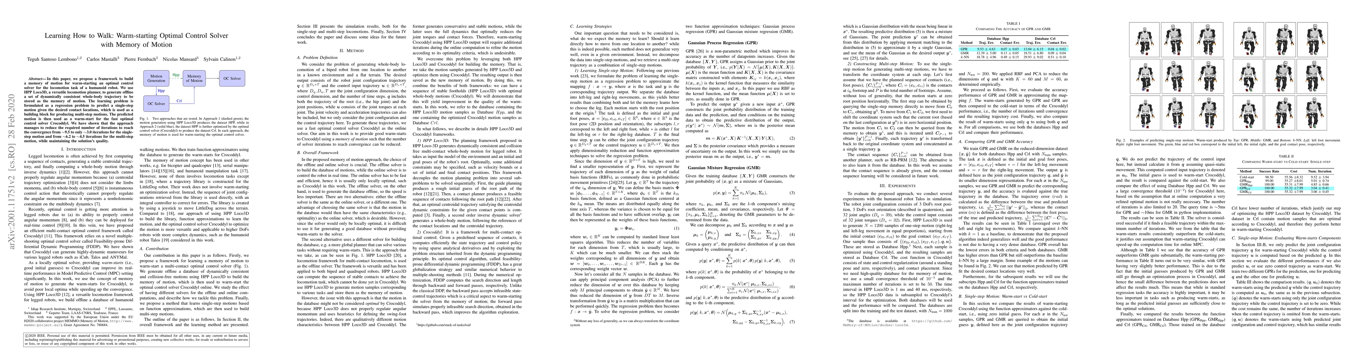 In this paper, we propose a framework to build a memory of motion for warm-starting an optimal control solver for the locomotion task of a humanoid robot. We use HPP Loco3D, a versatile locomotion planner, to generate offline a set of dynamically consistent whole-body trajectory to be stored as the memory of motion. The learning problem is formulated as a regression problem to predict a single-step motion given the desired contact locations, which is used as a building block for producing multi-step motions. The predicted motion is then used as a warm-start for the fast optimal control solver Crocoddyl. We have shown that the approach manages to reduce the required number of iterations to reach the convergence from $\sim$9.5 to only $\sim$3.0 iterations for the single-step motion and from $\sim$6.2 to $\sim$4.5 iterations for the multi-step motion, while maintaining the solution's quality.