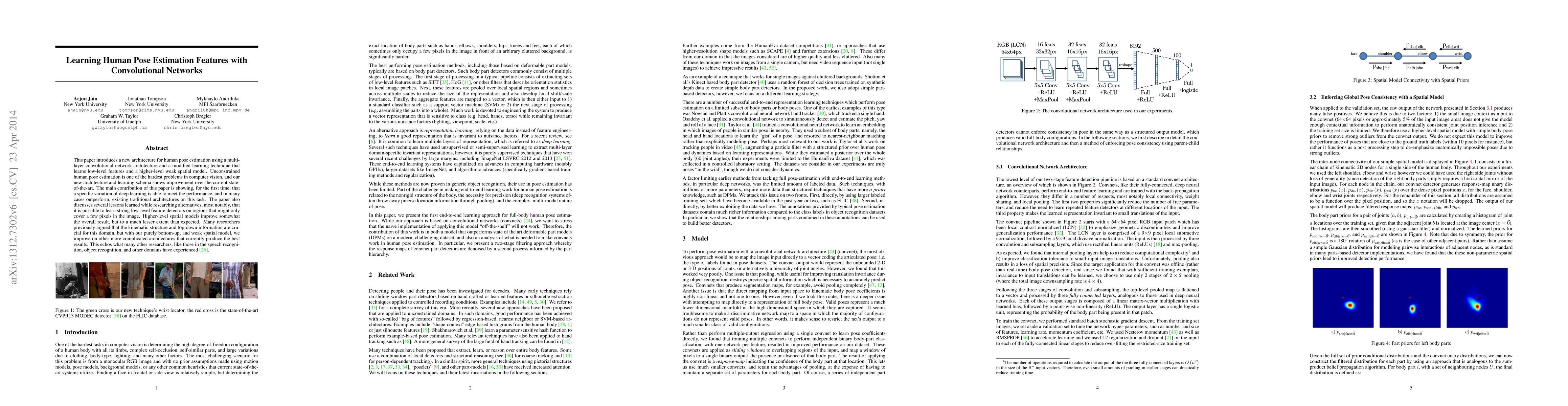 This paper introduces a new architecture for human pose estimation using a multi- layer convolutional network architecture and a modified learning technique that learns low-level features and higher-level weak spatial models. Unconstrained human pose estimation is one of the hardest problems in computer vision, and our new architecture and learning schema shows significant improvement over the current state-of-the-art results. The main contribution of this paper is showing, for the first time, that a specific variation of deep learning is able to outperform all existing traditional architectures on this task. The paper also discusses several lessons learned while researching alternatives, most notably, that it is possible to learn strong low-level feature detectors on features that might even just cover a few pixels in the image. Higher-level spatial models improve somewhat the overall result, but to a much lesser extent then expected. Many researchers previously argued that the kinematic structure and top-down information is crucial for this domain, but with our purely bottom up, and weak spatial model, we could improve other more complicated architectures that currently produce the best results. This mirrors what many other researchers, like those in the speech recognition, object recognition, and other domains have experienced.