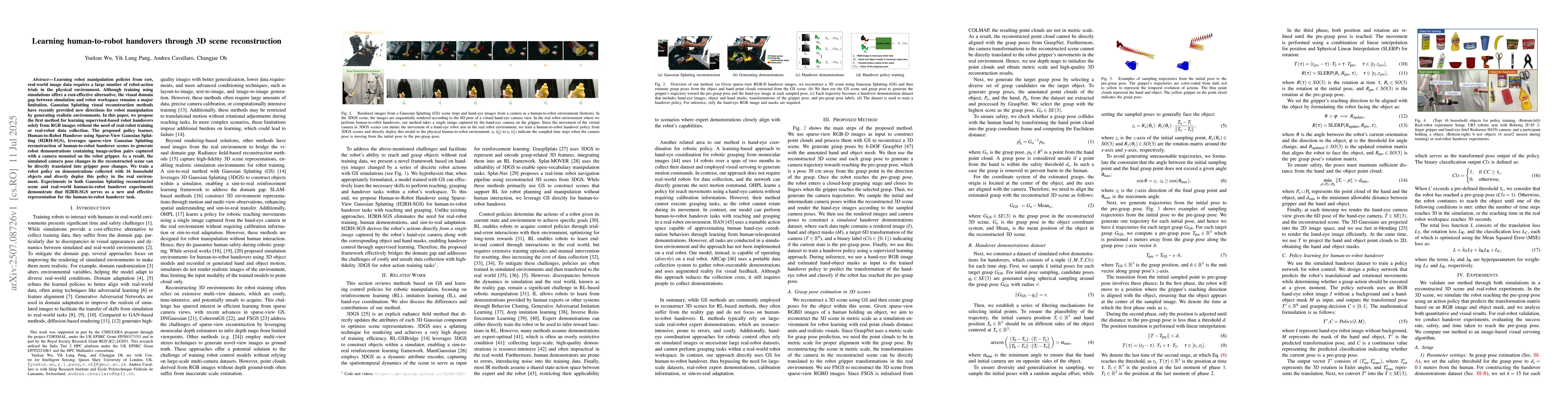 Learning robot manipulation policies from raw, real-world image data requires a large number of robot-action trials in the physical environment. Although training using simulations offers a cost-effective alternative, the visual domain gap between simulation and robot workspace remains a major limitation. Gaussian Splatting visual reconstruction methods have recently provided new directions for robot manipulation by generating realistic environments. In this paper, we propose the first method for learning supervised-based robot handovers solely from RGB images without the need of real-robot training or real-robot data collection. The proposed policy learner, Human-to-Robot Handover using Sparse-View Gaussian Splatting (H2RH-SGS), leverages sparse-view Gaussian Splatting reconstruction of human-to-robot handover scenes to generate robot demonstrations containing image-action pairs captured with a camera mounted on the robot gripper. As a result, the simulated camera pose changes in the reconstructed scene can be directly translated into gripper pose changes. We train a robot policy on demonstrations collected with 16 household objects and {\em directly} deploy this policy in the real environment. Experiments in both Gaussian Splatting reconstructed scene and real-world human-to-robot handover experiments demonstrate that H2RH-SGS serves as a new and effective representation for the human-to-robot handover task.