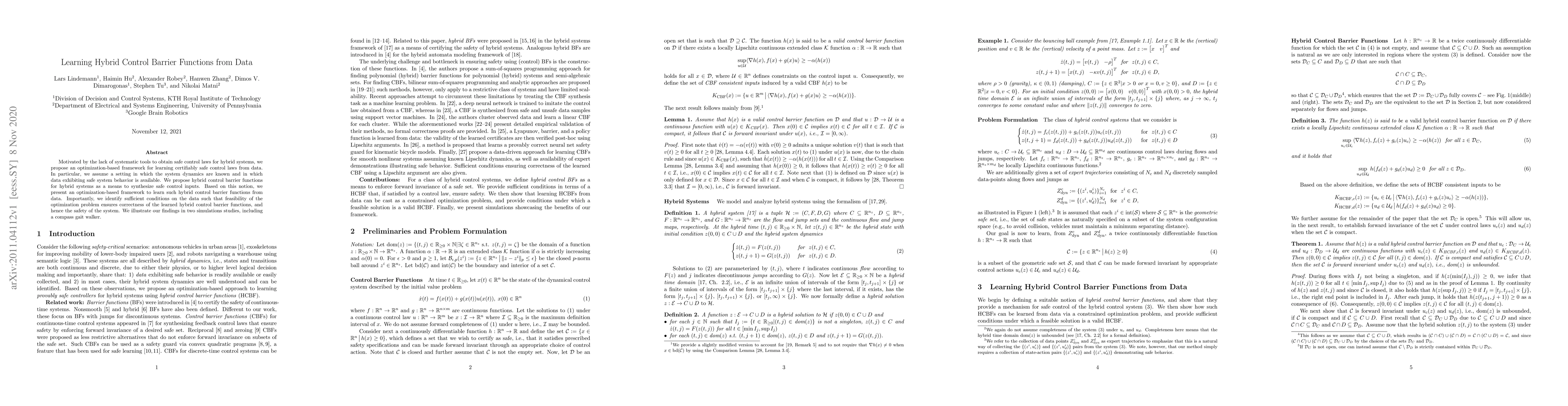 This paper proposes an optimization-based framework to learn certifiably safe control laws for hybrid systems from available data. It introduces hybrid control barrier functions and provides sufficient conditions ensuring the safety of the synthesized control inputs, demonstrated through simulations involving a compass gait walker.