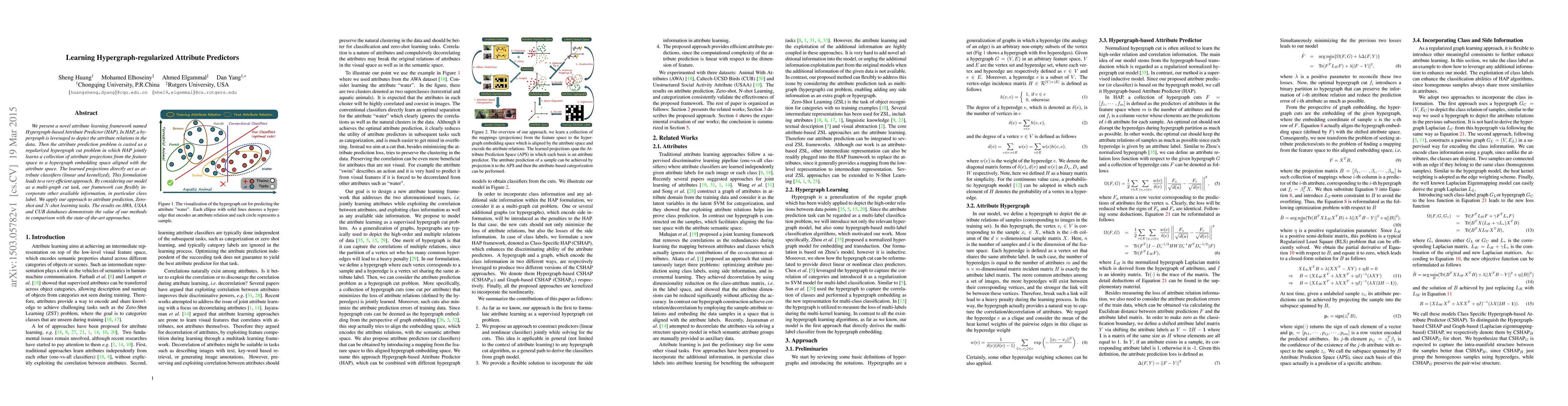 We present a novel attribute learning framework named Hypergraph-based Attribute Predictor (HAP). In HAP, a hypergraph is leveraged to depict the attribute relations in the data. Then the attribute prediction problem is casted as a regularized hypergraph cut problem in which HAP jointly learns a collection of attribute projections from the feature space to a hypergraph embedding space aligned with the attribute space. The learned projections directly act as attribute classifiers (linear and kernelized). This formulation leads to a very efficient approach. By considering our model as a multi-graph cut task, our framework can flexibly incorporate other available information, in particular class label. We apply our approach to attribute prediction, Zero-shot and $N$-shot learning tasks. The results on AWA, USAA and CUB databases demonstrate the value of our methods in comparison with the state-of-the-art approaches.