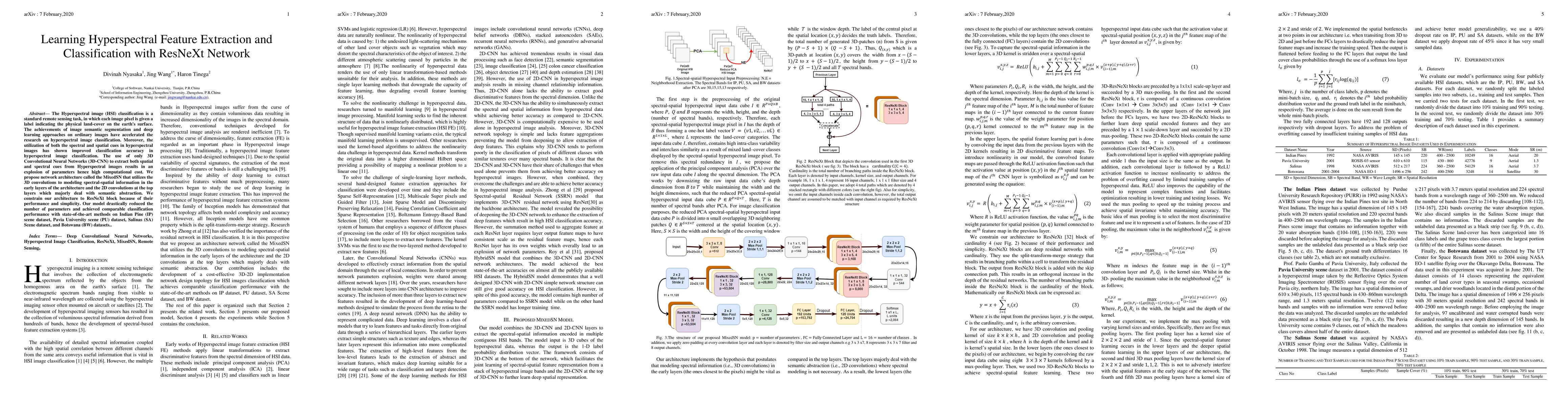 This research proposes a novel network architecture called MixedSN for hyperspectral image classification, which combines 3D convolutions for early spectral-spatial feature extraction and 2D convolutions for semantic abstraction. Utilizing the ResNeXt block, the model significantly reduces parameters while achieving competitive classification performance on multiple datasets. For detailed insights, please refer to the original paper.