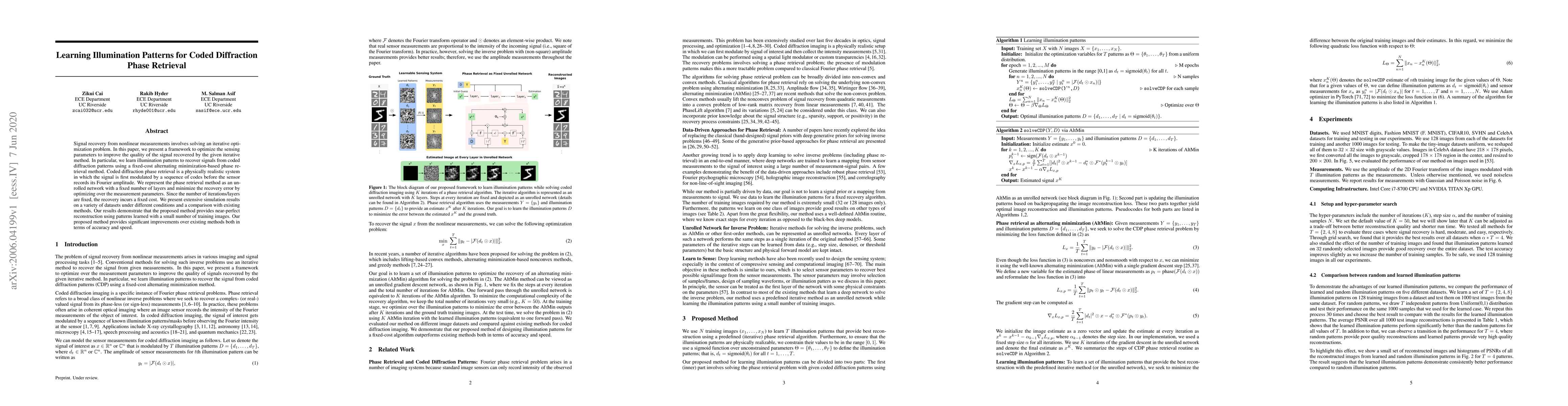 This paper proposes a framework to optimize sensing parameters for coded diffraction phase retrieval by learning illumination patterns, achieving near-perfect signal recovery with a fixed-cost iterative method. The method outperforms existing techniques in both accuracy and speed, demonstrated through extensive simulations.
