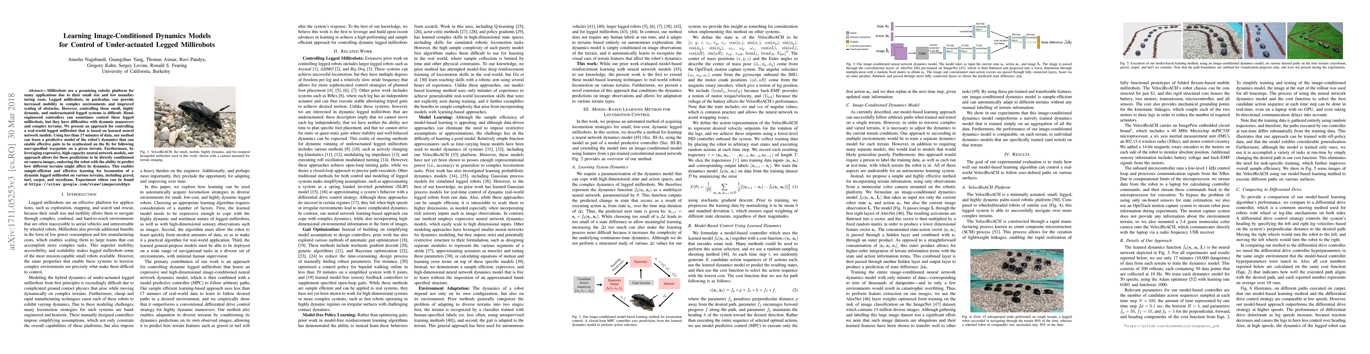 This paper proposes a neural network-based method for learning the dynamics of legged millirobots to enable effective control on various terrains. Using only 17 minutes of data, the model can predict the robot's dynamics conditioned on camera images, allowing for dynamic gaits and terrain adaptability.