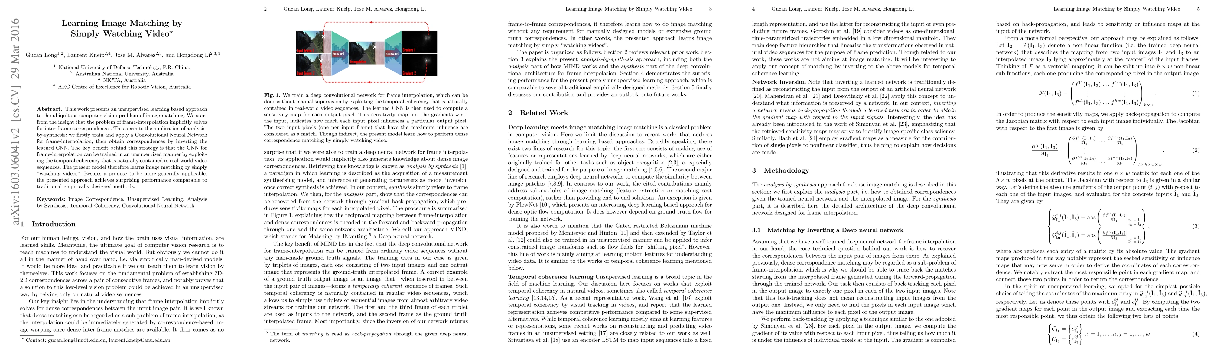Researchers developed an unsupervised learning approach to image matching by training a Convolutional Neural Network on video sequences, achieving comparable performance to traditional methods, without needing explicit frame pairs or labels.