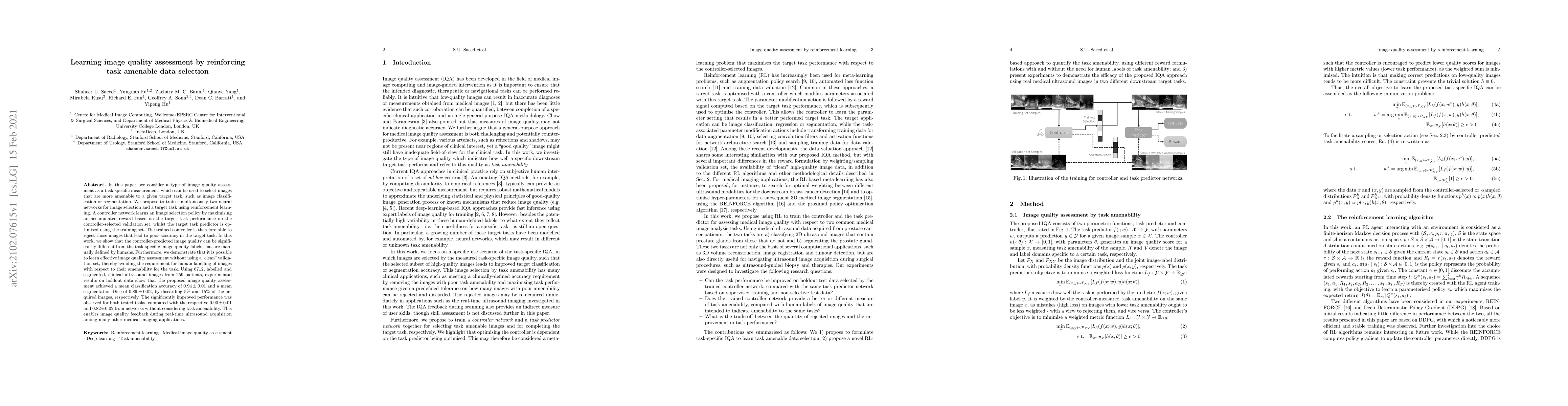 This paper proposes a reinforcement learning approach to assess image quality for task-specific selection, training two neural networks to optimize image selection and target task performance. Experimental results show improved classification and segmentation accuracy by discarding less amenable images, achieving mean accuracies of 0.94 and 0.89, respectively, without requiring manual labelling.