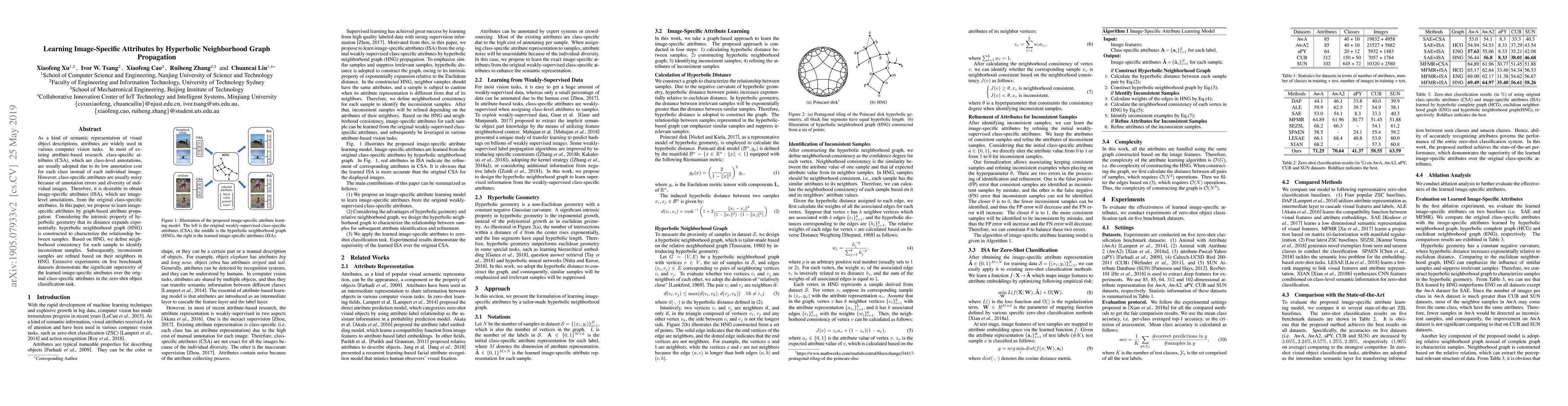 As a kind of semantic representation of visual object descriptions, attributes are widely used in various computer vision tasks. In most of existing attribute-based research, class-specific attributes (CSA), which are class-level annotations, are usually adopted due to its low annotation cost for each class instead of each individual image. However, class-specific attributes are usually noisy because of annotation errors and diversity of individual images. Therefore, it is desirable to obtain image-specific attributes (ISA), which are image-level annotations, from the original class-specific attributes. In this paper, we propose to learn image-specific attributes by graph-based attribute propagation. Considering the intrinsic property of hyperbolic geometry that its distance expands exponentially, hyperbolic neighborhood graph (HNG) is constructed to characterize the relationship between samples. Based on HNG, we define neighborhood consistency for each sample to identify inconsistent samples. Subsequently, inconsistent samples are refined based on their neighbors in HNG. Extensive experiments on five benchmark datasets demonstrate the significant superiority of the learned image-specific attributes over the original class-specific attributes in the zero-shot object classification task.
