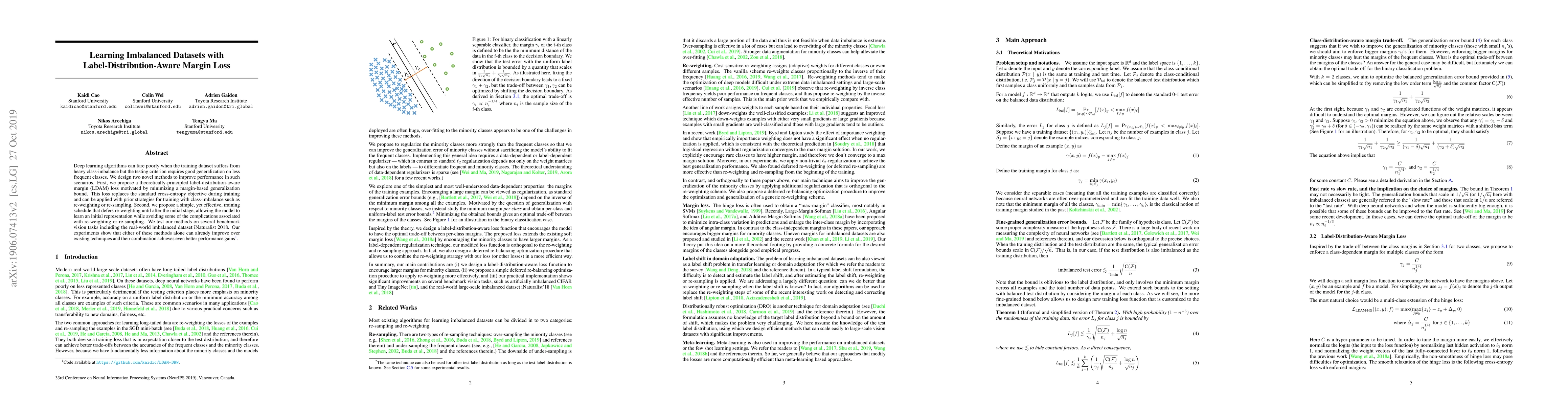This paper proposes a label-distribution-aware margin loss (LDAM) to enhance deep learning performance on imbalanced datasets, and a training schedule that defers re-weighting to improve initial representation learning. Experiments on vision tasks show improved performance over existing techniques.