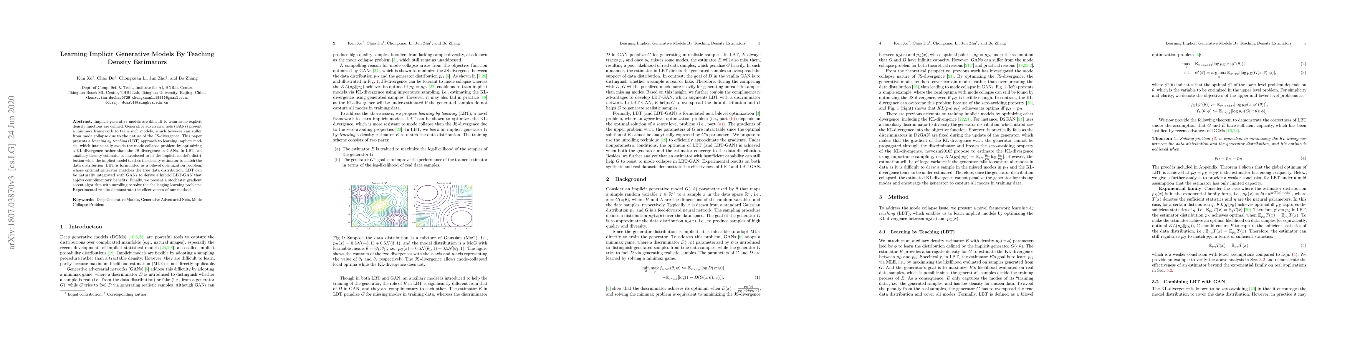 This paper introduces a learning by teaching (LBT) approach to train implicit generative models, avoiding mode collapse by optimizing a KL-divergence instead of the JS-divergence in GANs. LBT integrates an auxiliary density estimator and formulates a bilevel optimization problem, resulting in a hybrid LBT-GAN that combines benefits, and employs a stochastic gradient ascent algorithm for effective training.