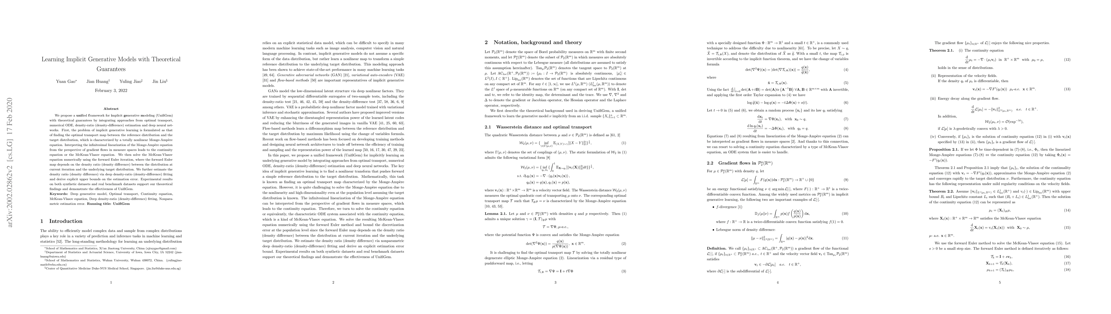 We propose a \textbf{uni}fied \textbf{f}ramework for \textbf{i}mplicit \textbf{ge}nerative \textbf{m}odeling (UnifiGem) with theoretical guarantees by integrating approaches from optimal transport, numerical ODE, density-ratio (density-difference) estimation and deep neural networks. First, the problem of implicit generative learning is formulated as that of finding the optimal transport map between the reference distribution and the target distribution, which is characterized by a totally nonlinear Monge-Amp\`{e}re equation. Interpreting the infinitesimal linearization of the Monge-Amp\`{e}re equation from the perspective of gradient flows in measure spaces leads to the continuity equation or the McKean-Vlasov equation. We then solve the McKean-Vlasov equation numerically using the forward Euler iteration, where the forward Euler map depends on the density ratio (density difference) between the distribution at current iteration and the underlying target distribution. We further estimate the density ratio (density difference) via deep density-ratio (density-difference) fitting and derive explicit upper bounds on the estimation error. Experimental results on both synthetic datasets and real benchmark datasets support our theoretical findings and demonstrate the effectiveness of UnifiGem.