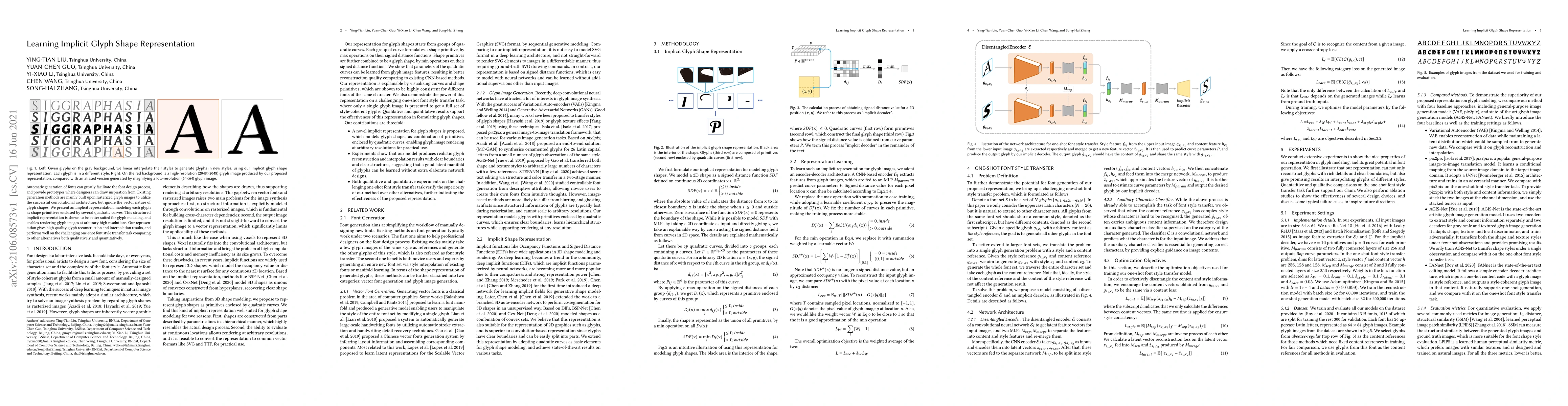 This paper introduces an implicit glyph shape representation using quadratic curves, enabling high-resolution glyph generation and effective font reconstruction. It also proposes a disentangled network for one-shot font style transfer, achieving superior results compared to existing methods.