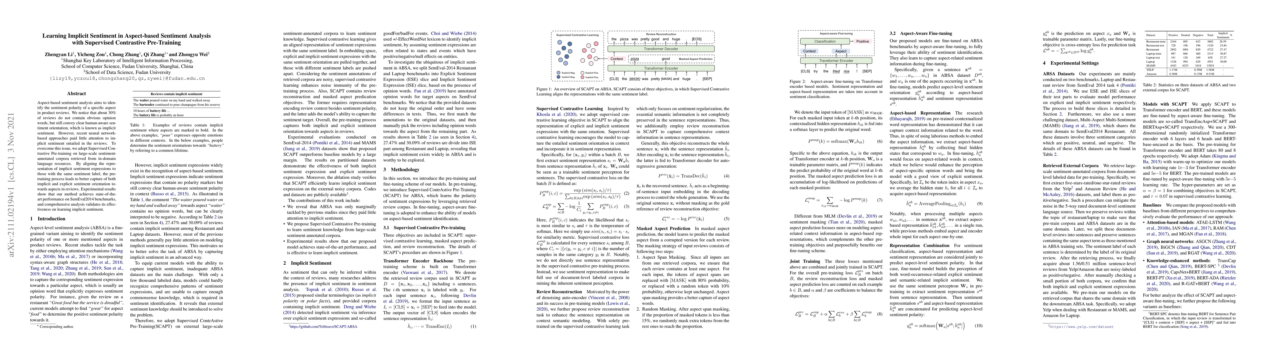 This paper proposes a method using Supervised Contrastive Pre-training to enhance aspect-based sentiment analysis by capturing implicit sentiment in reviews lacking explicit opinion words. The approach achieves state-of-the-art results on SemEval2014 benchmarks, demonstrating improved performance in identifying sentiment orientation towards specific aspects.